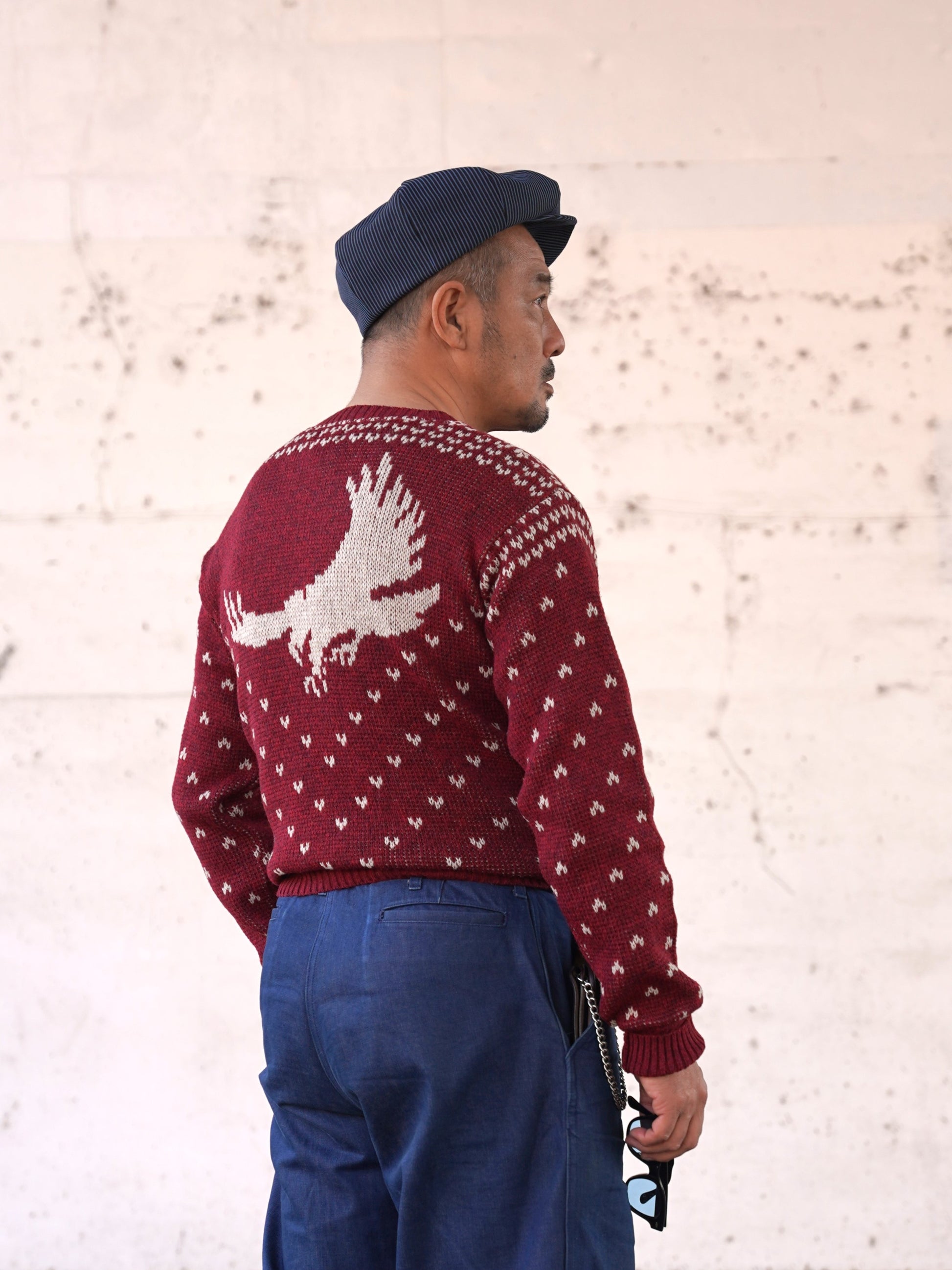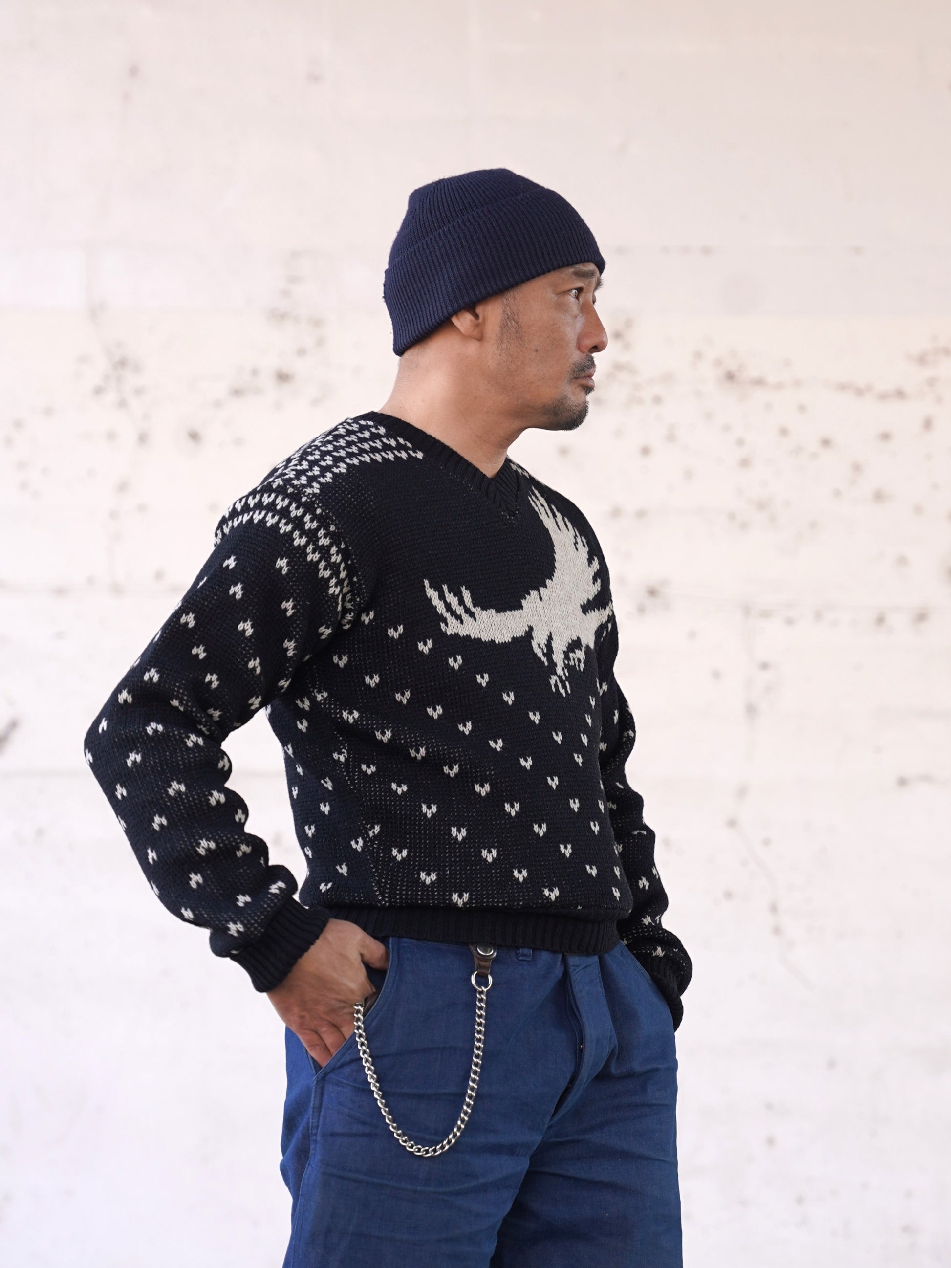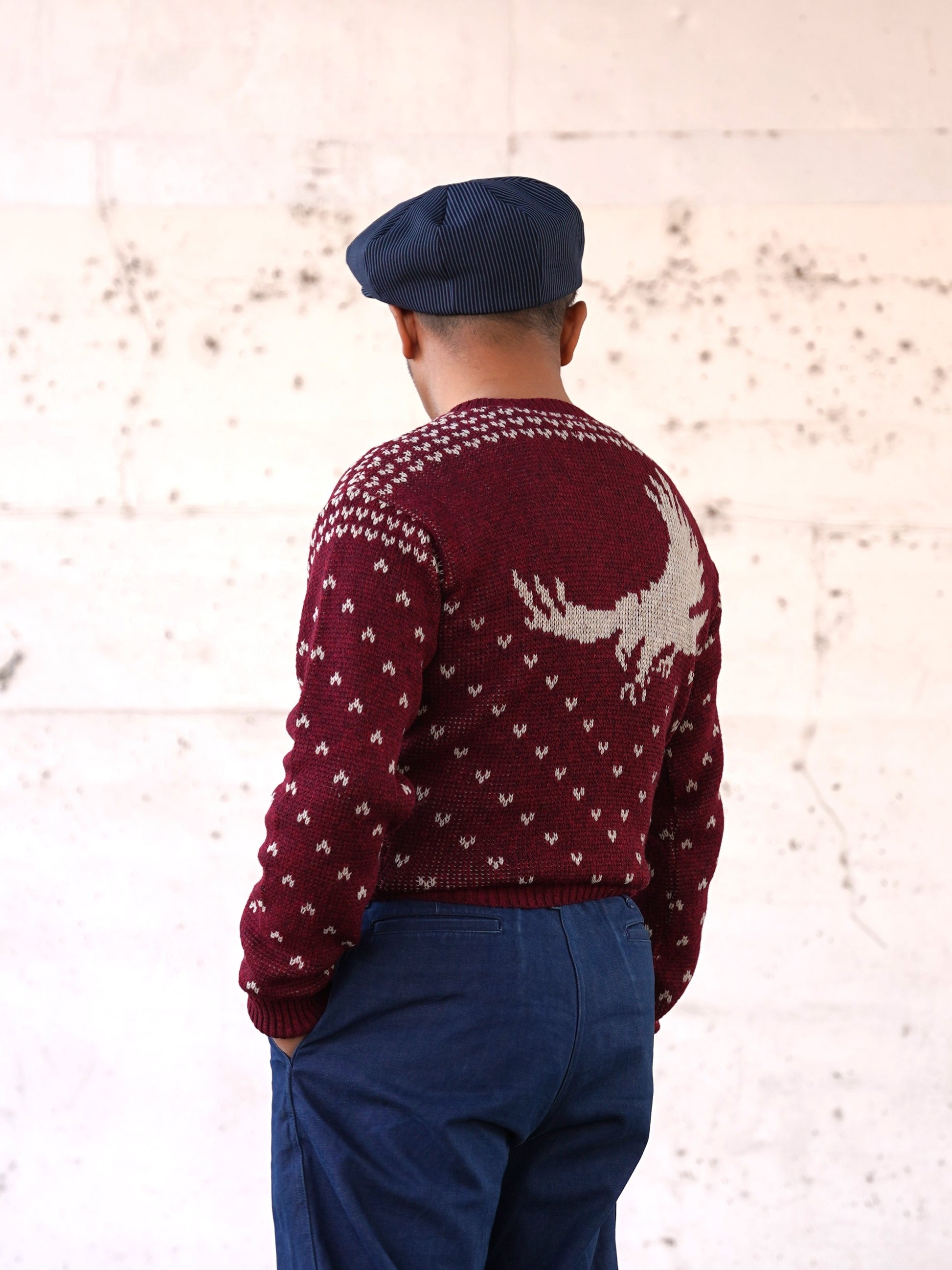 1940年代スタイルのVネックニット。アメリカのストアブランドで販売されていたレアな柄を、オリジナルの編目通りに再現しました。デザインは当時のそのままで、当時の雰囲気を感じられる製品に仕上がっています。