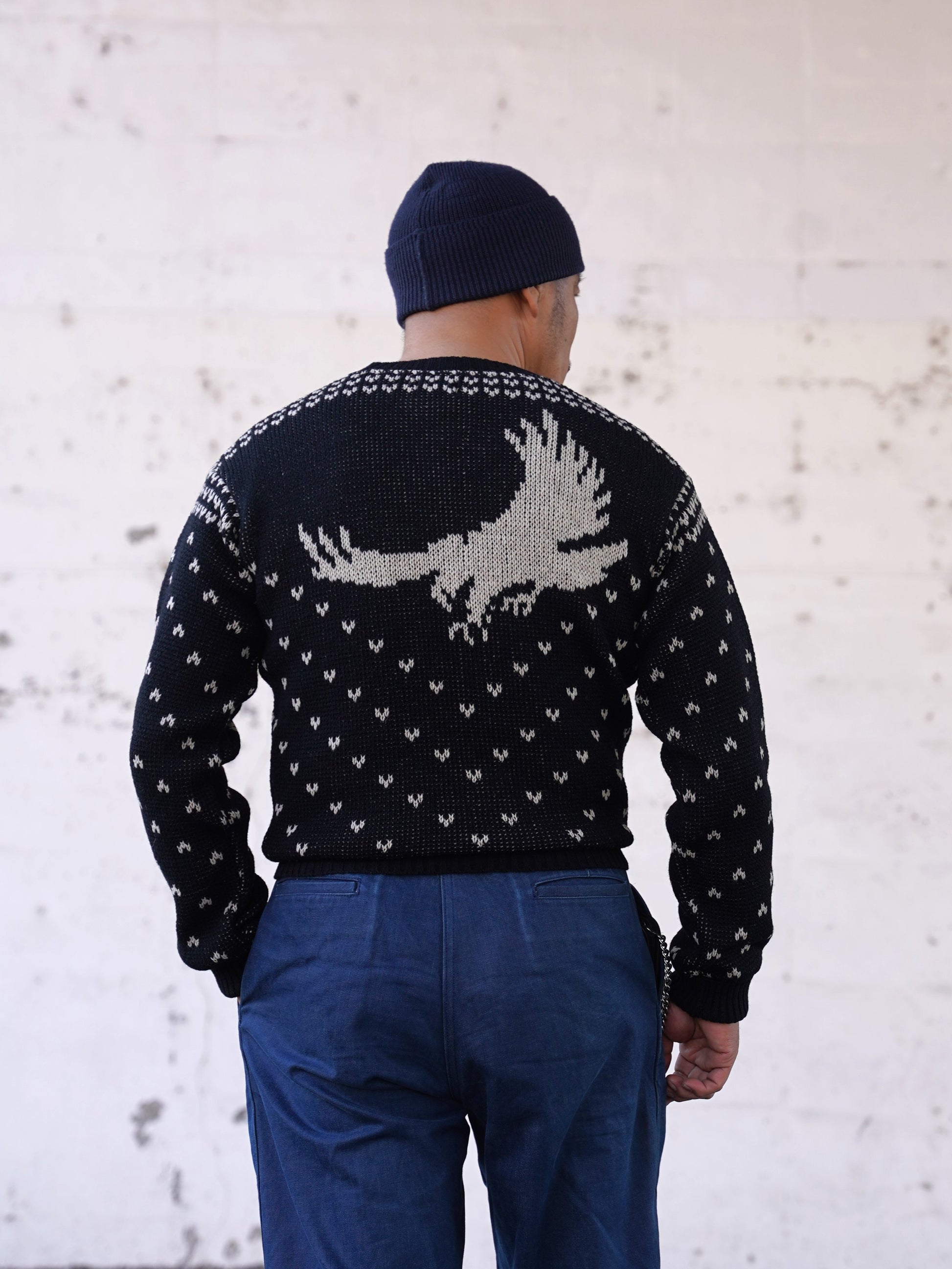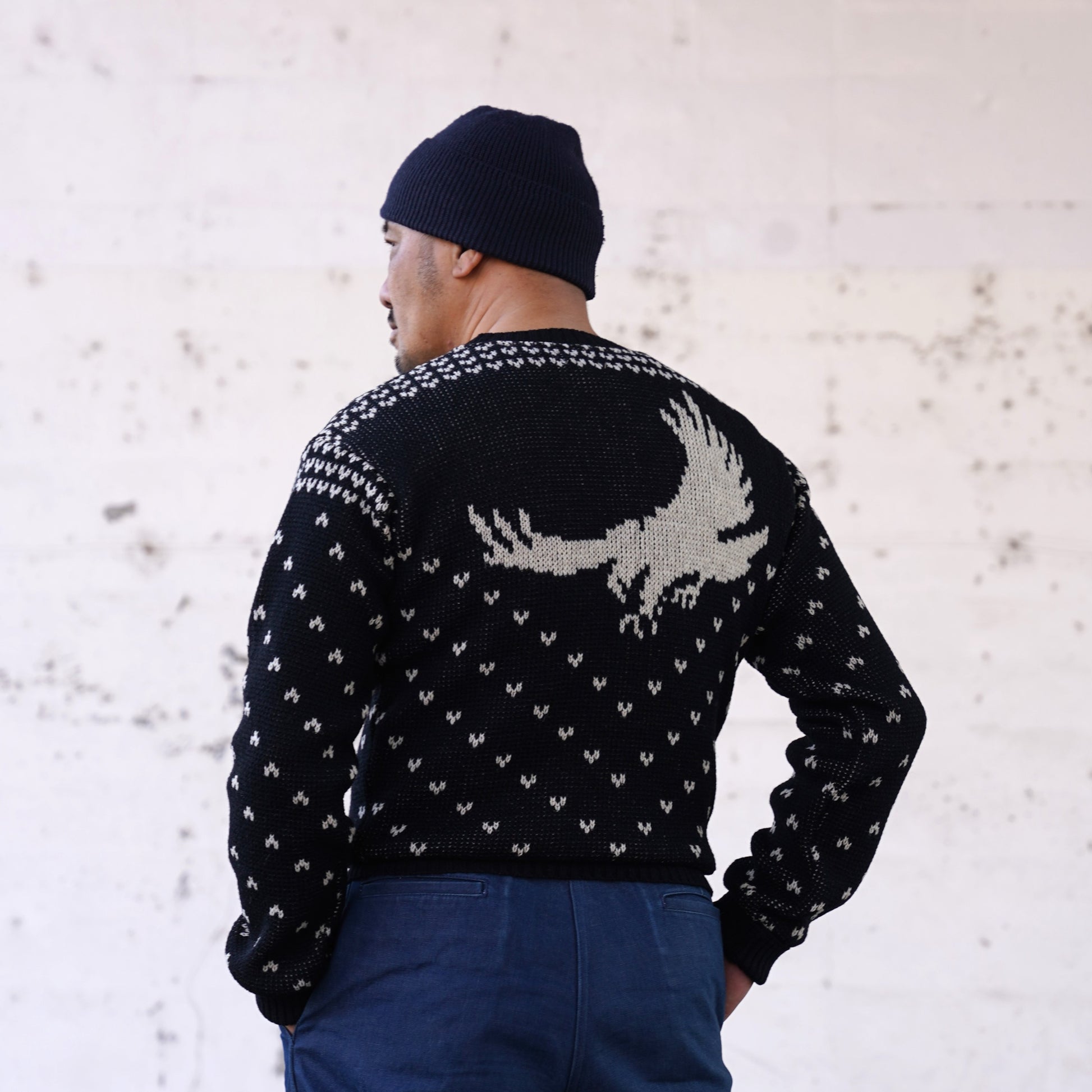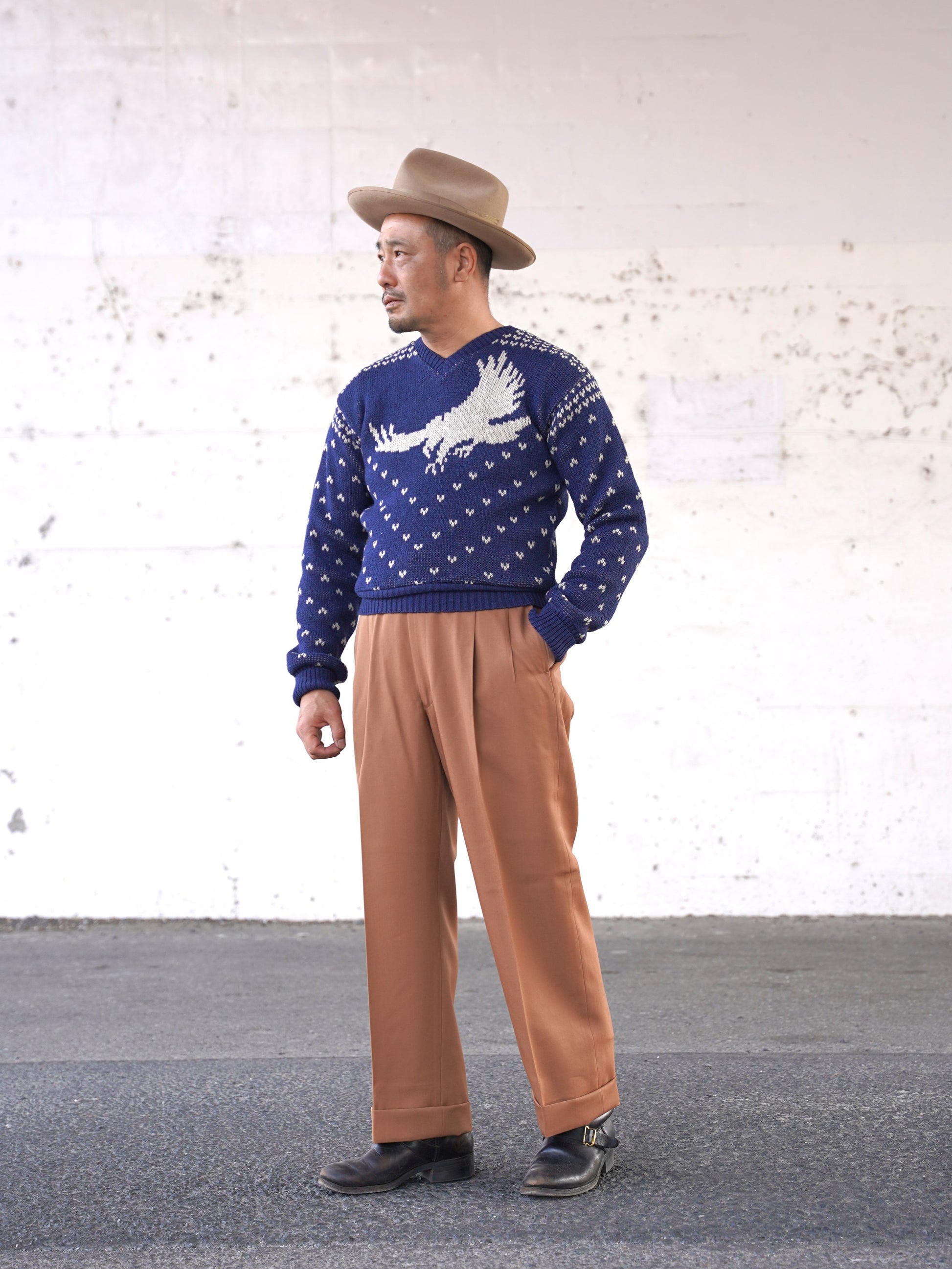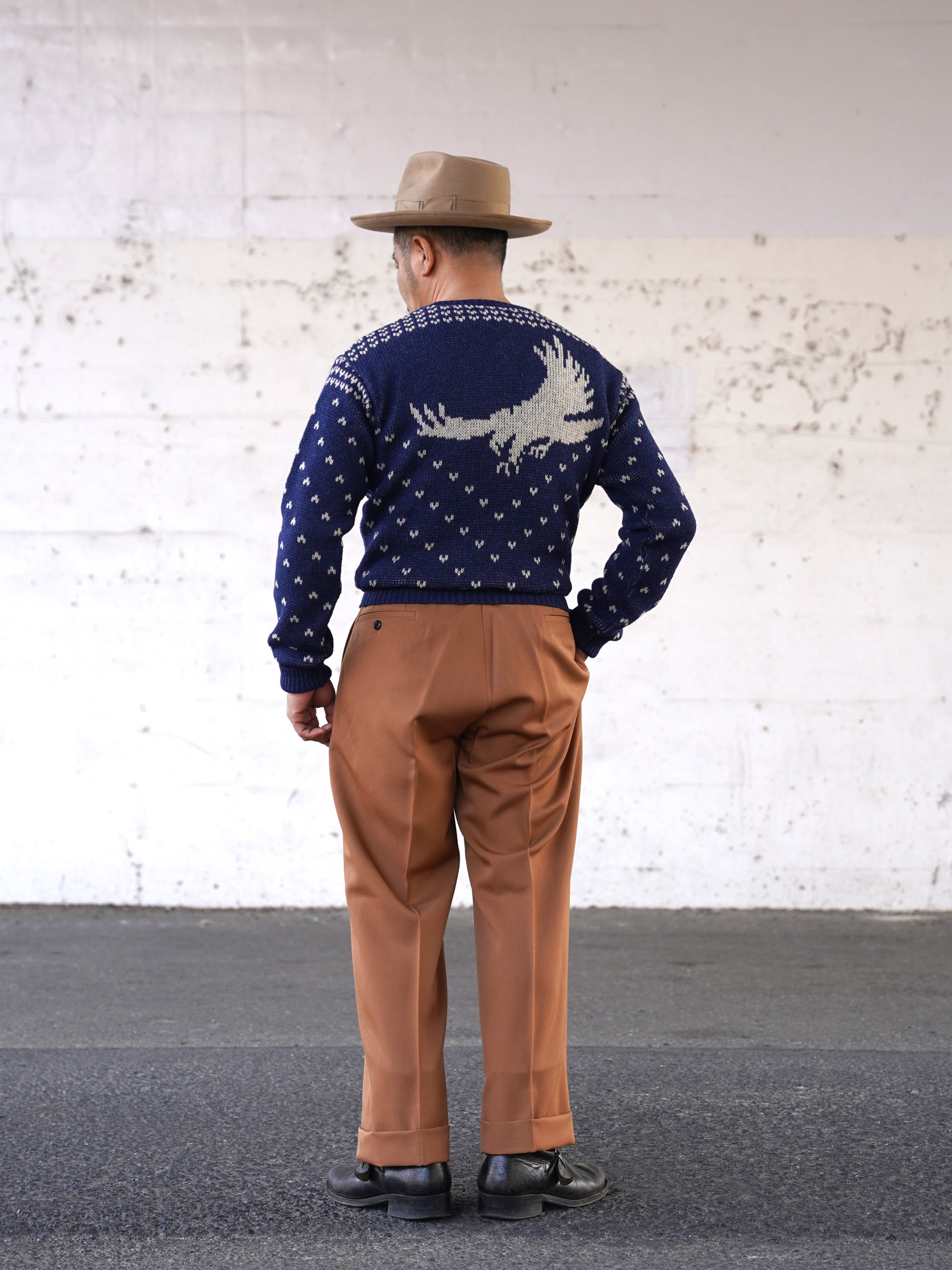 1940年代スタイルのVネックニット。アメリカのストアブランドで販売されていたレアな柄を、オリジナルの編目通りに再現しました。デザインは当時のそのままで、当時の雰囲気を感じられる製品に仕上がっています。