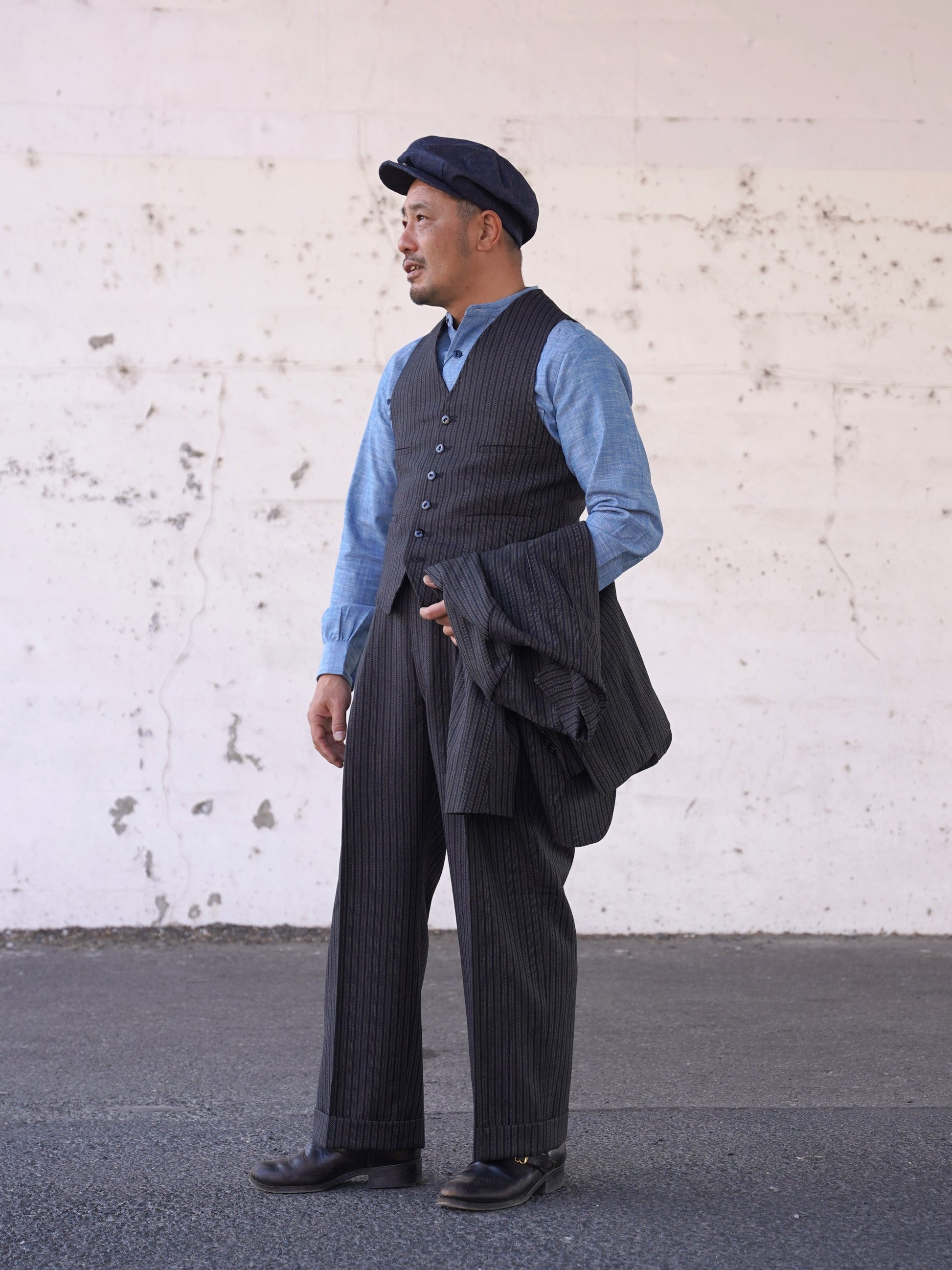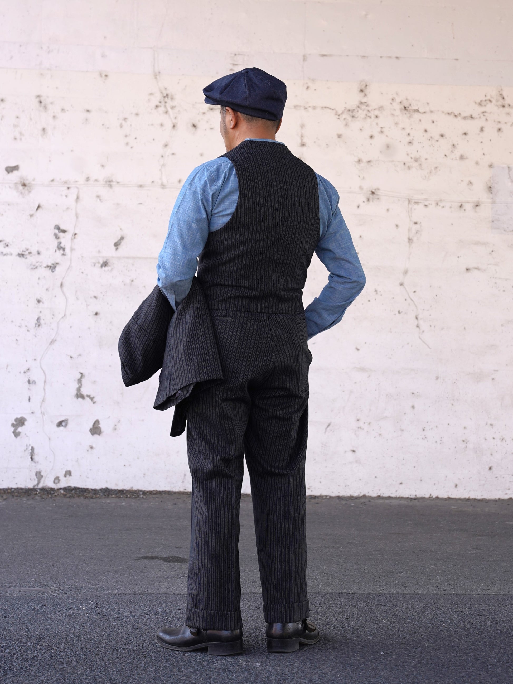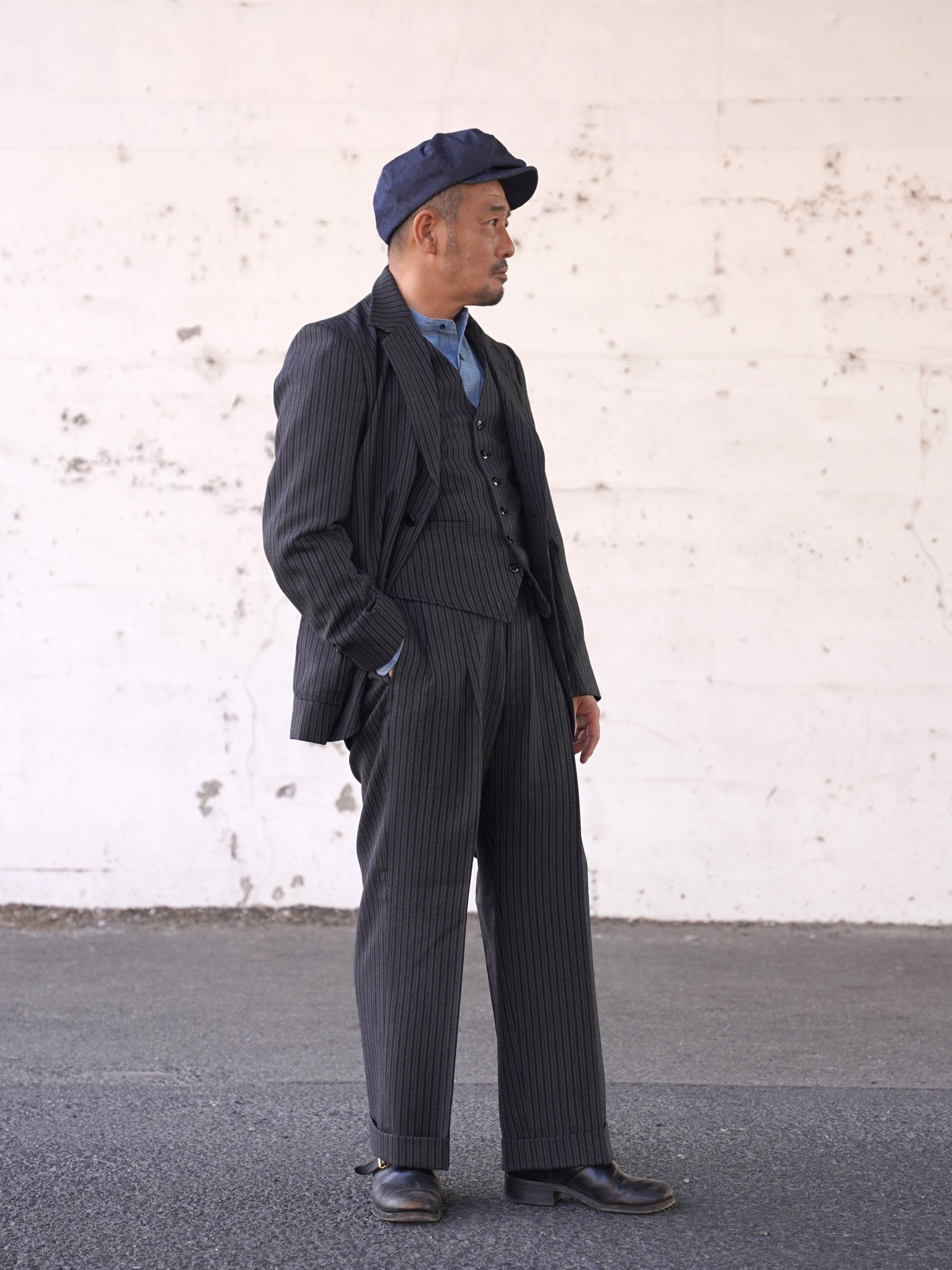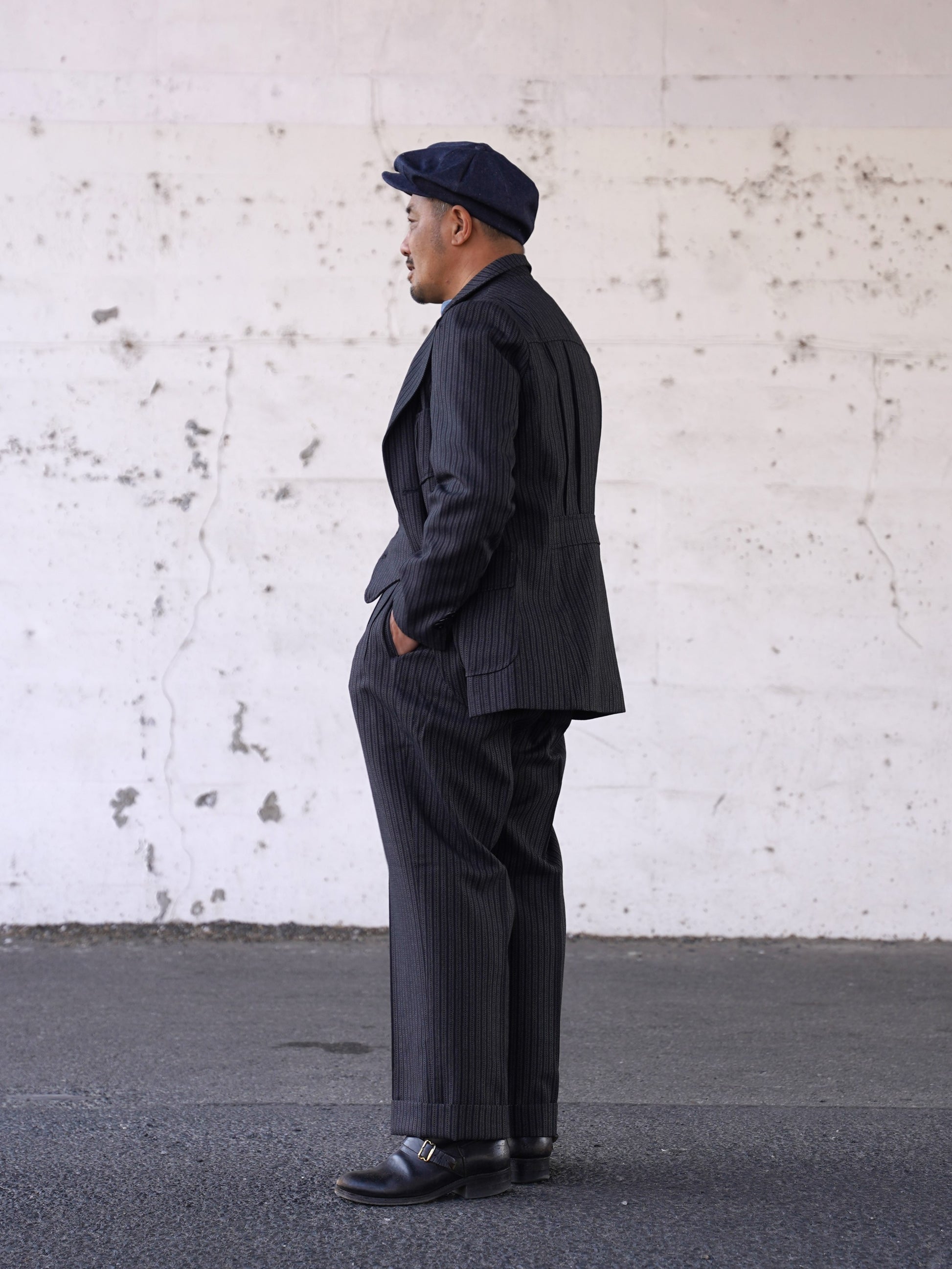 1940年代のシングルスリーピース。スラックス、ジャケット、ベストのどれをとっても当時を感じさせるビンテージ感あふれるデザインです。生地は1941~1942年の生地サンプルを元に、糸から厳選して制作しています。
