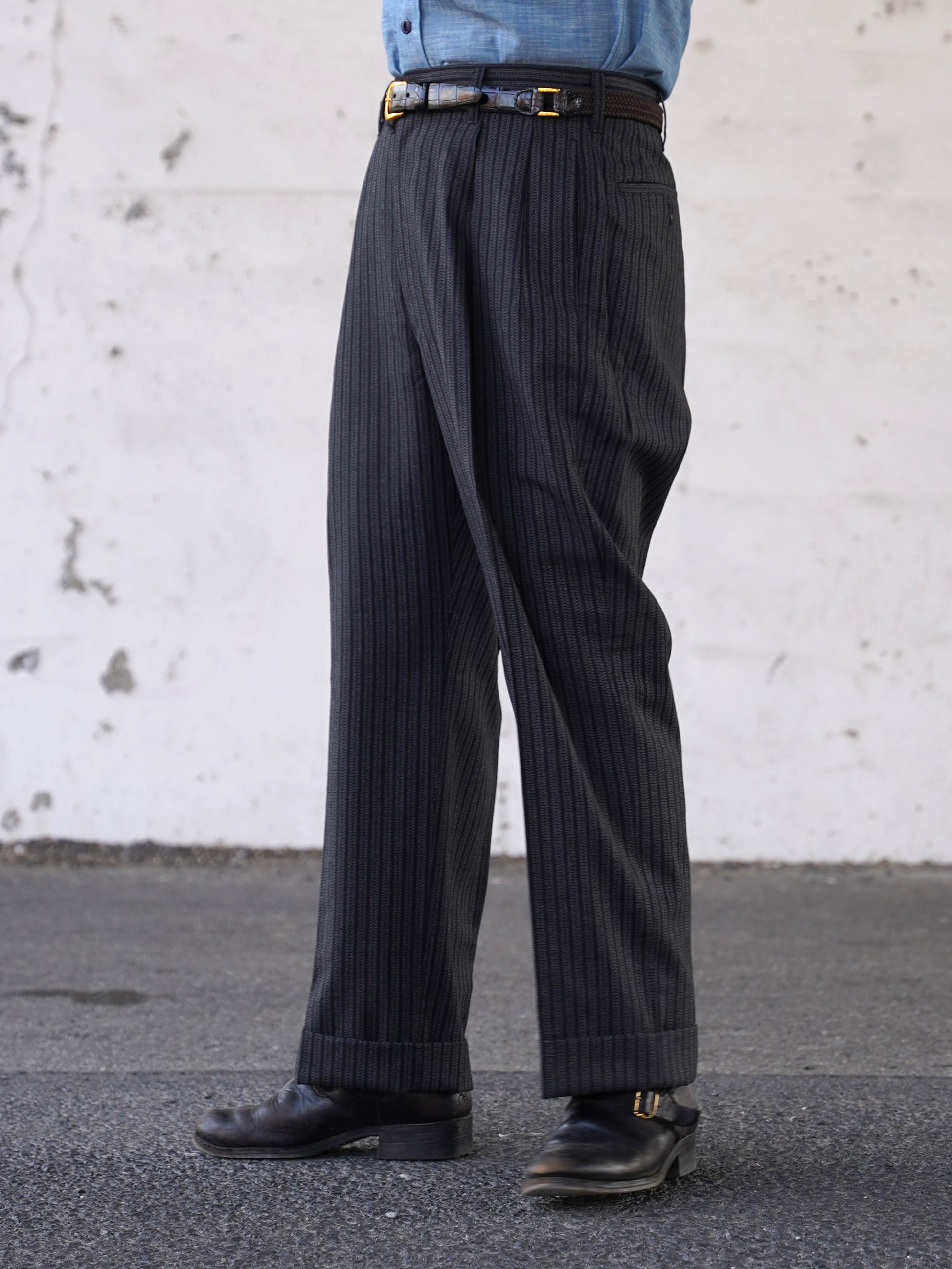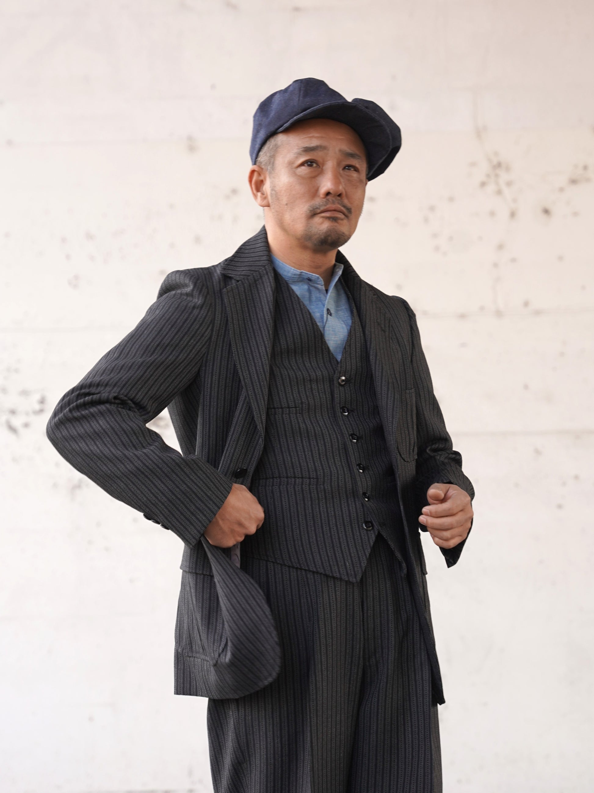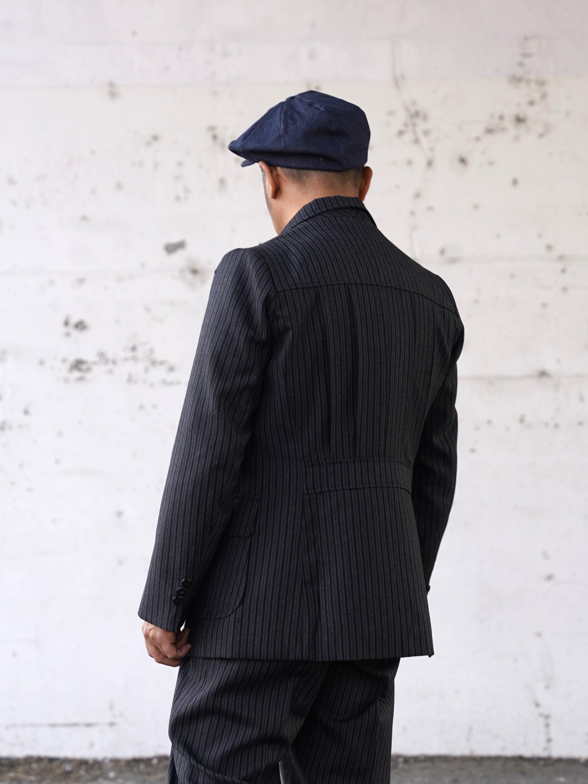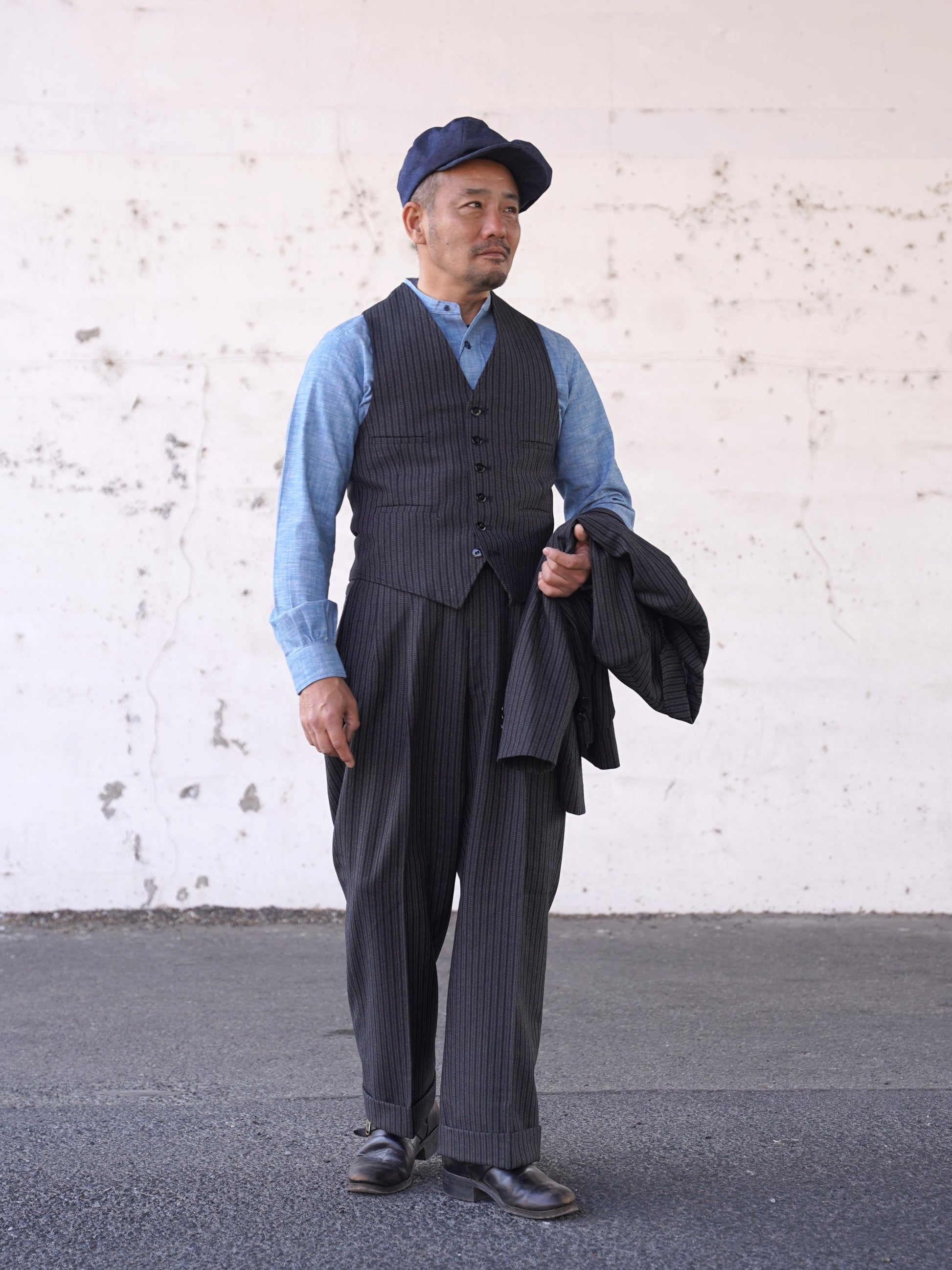 1940年代のシングルスリーピース。スラックス、ジャケット、ベストのどれをとっても当時を感じさせるビンテージ感あふれるデザインです。生地は1941~1942年の生地サンプルを元に、糸から厳選して制作しています。