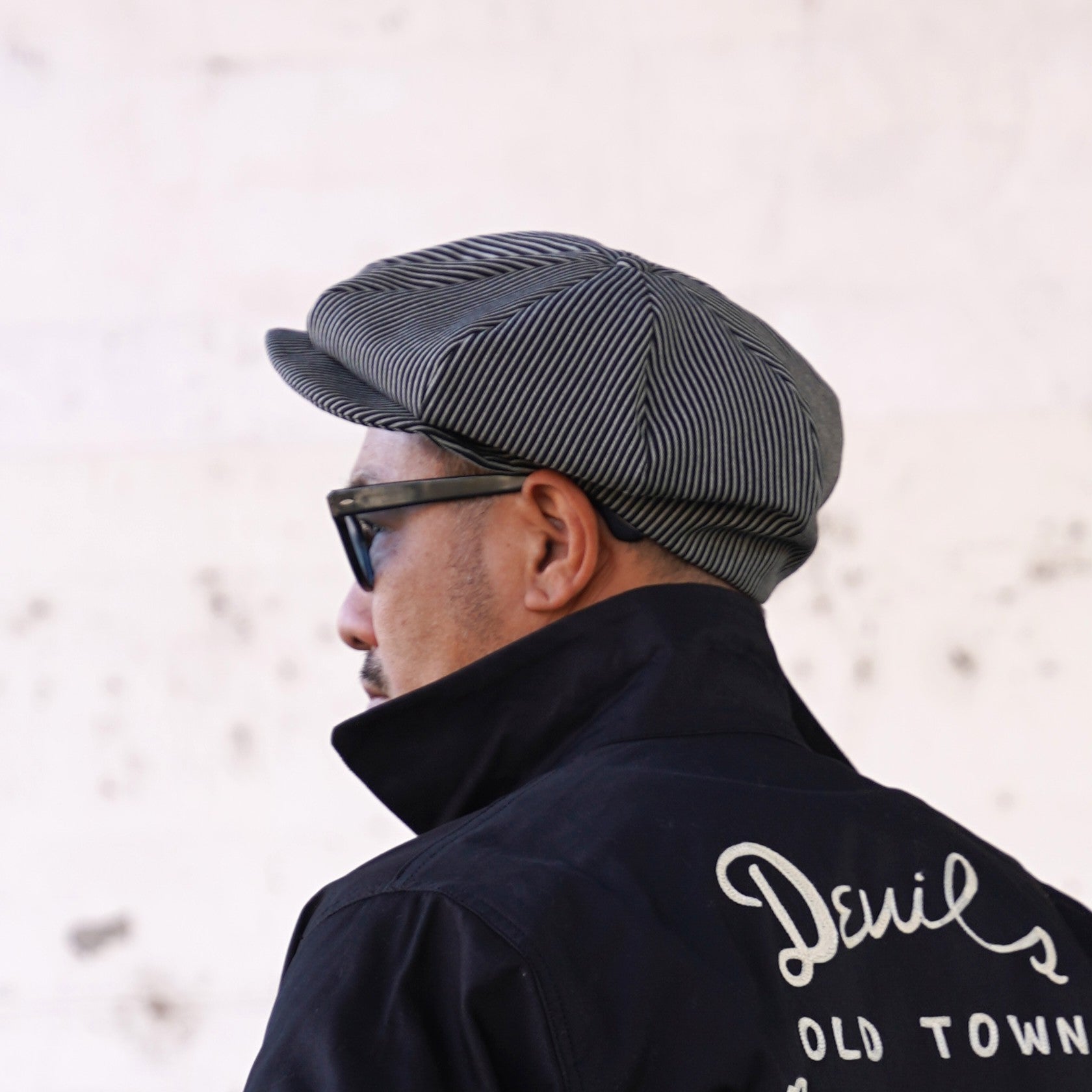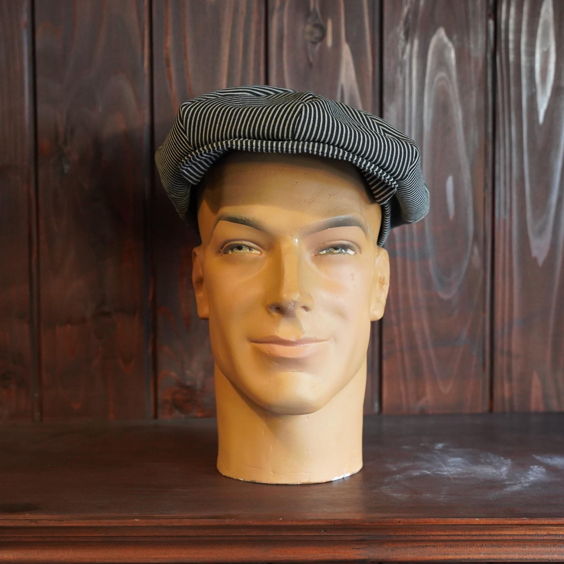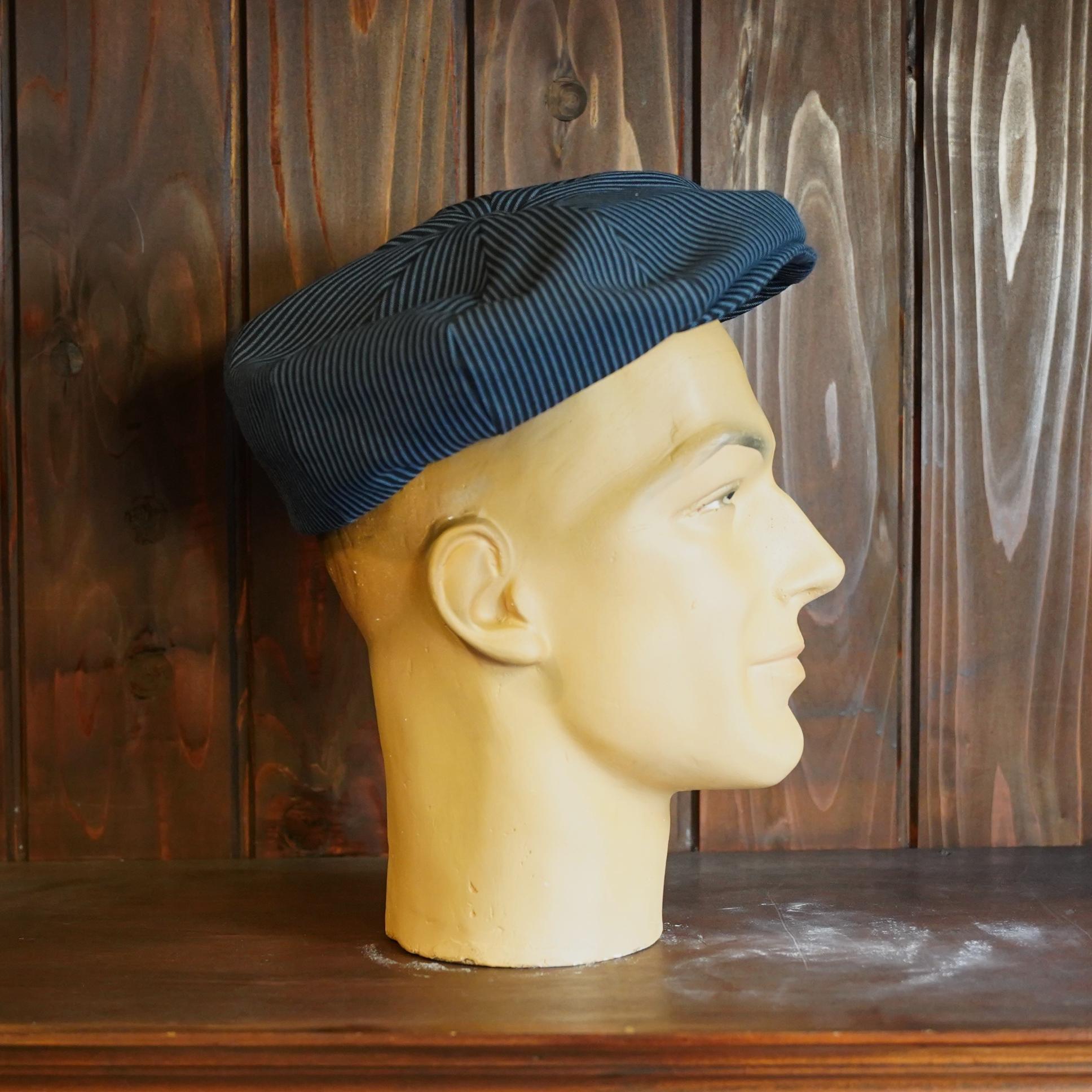 グルービン定番の1940年代小さめ綿なしのキャスケット。オリジナルの帽子をばらしてそのまま同じサイズ、デザインで復元しています。裏地はオリジナルのコットン生地、鉄バックルを使用し、スベリにはロゴマークの箔押しが入っています。