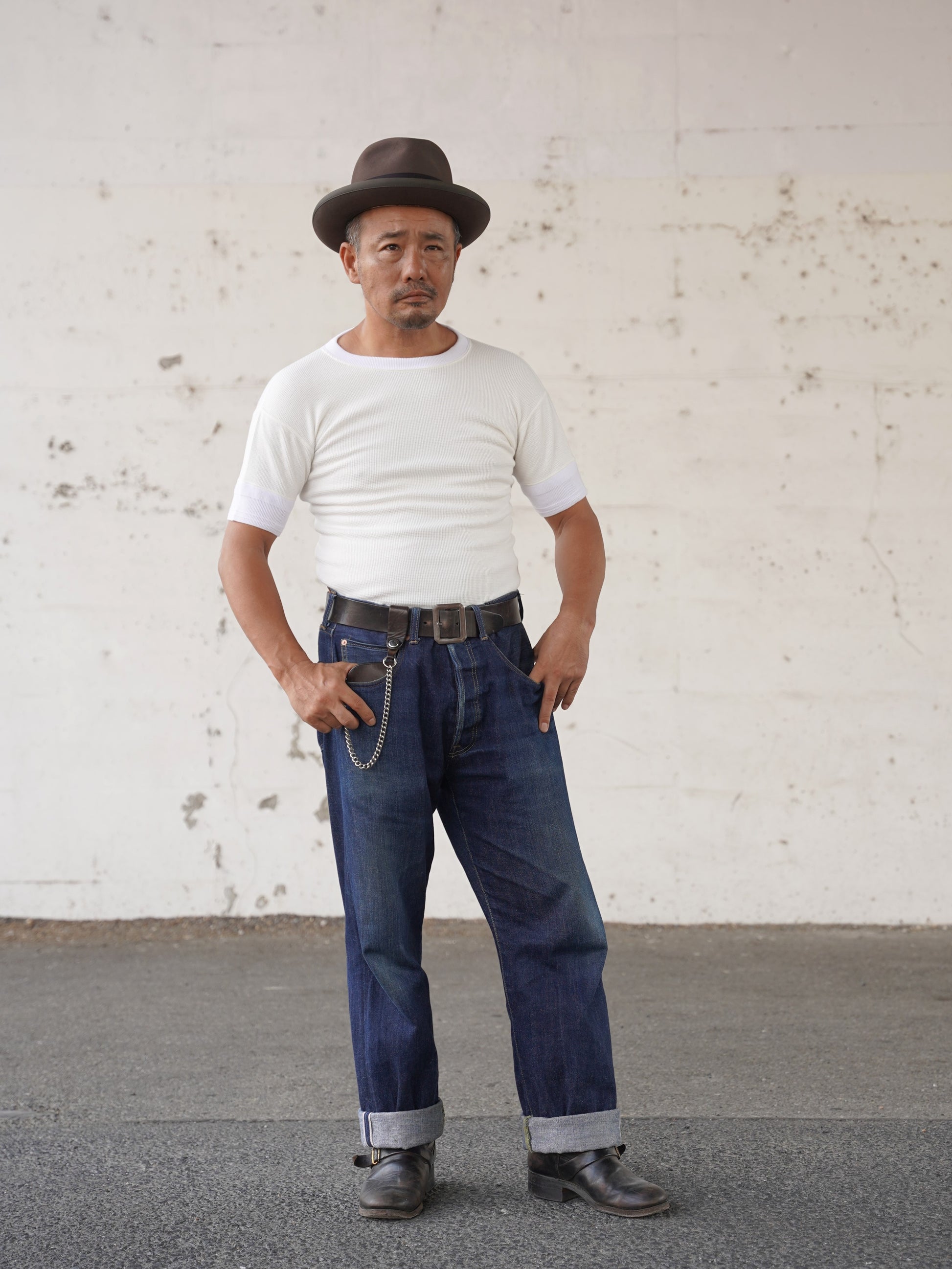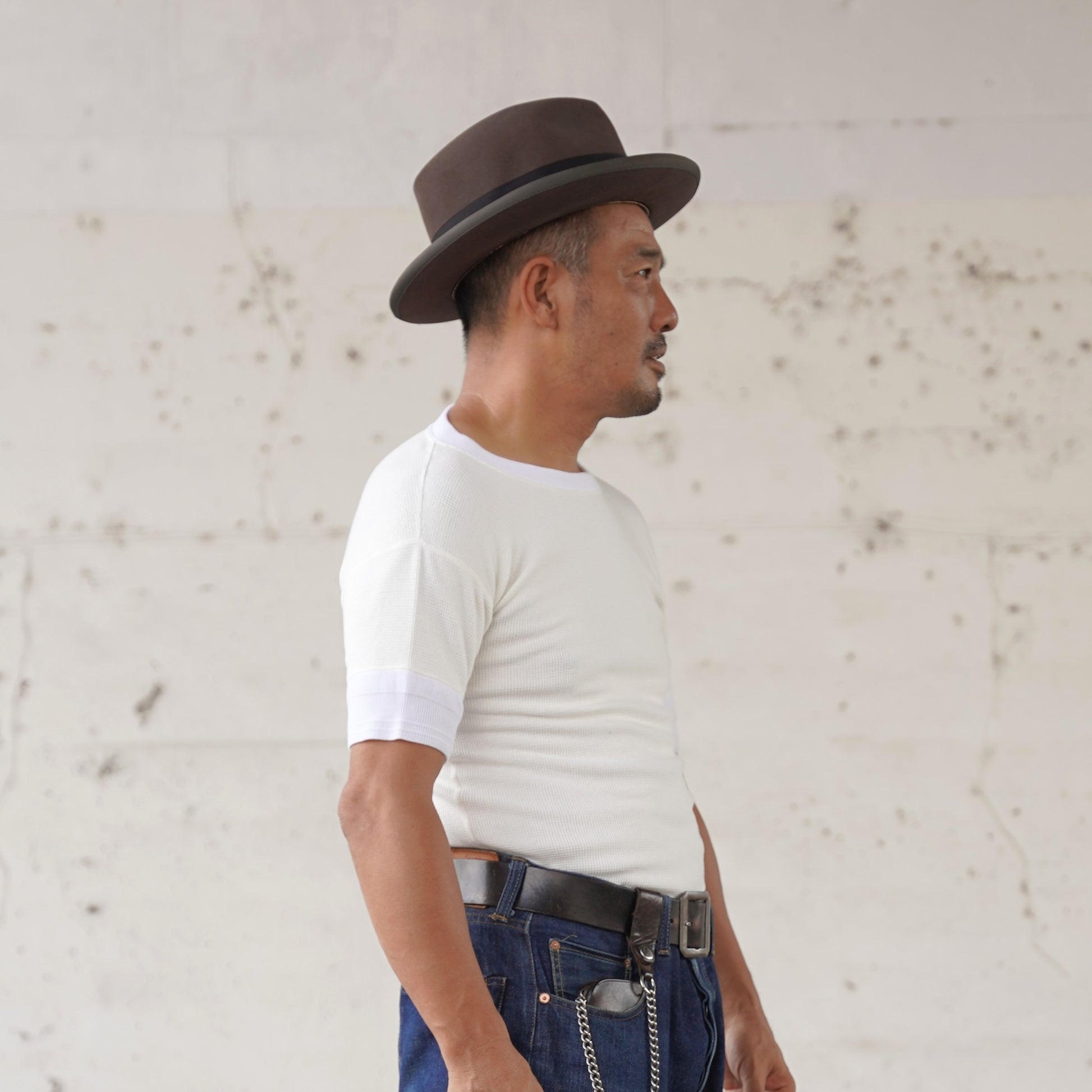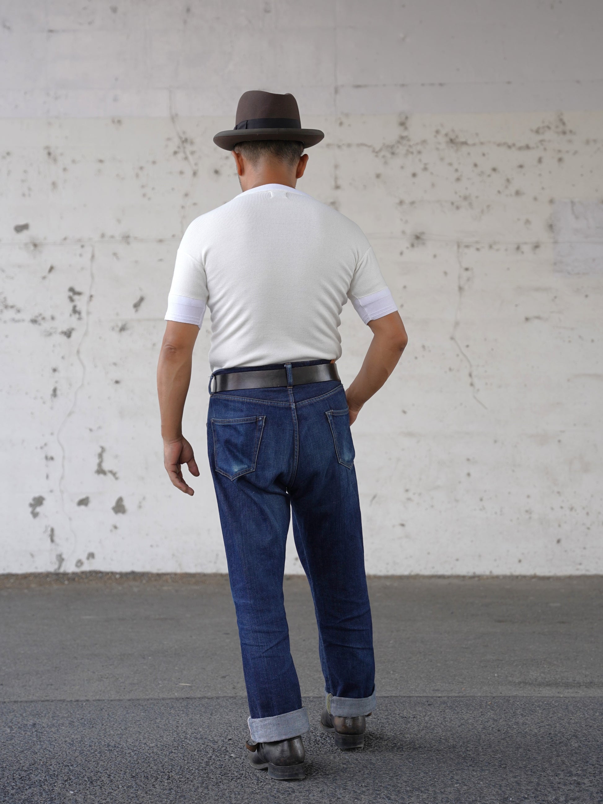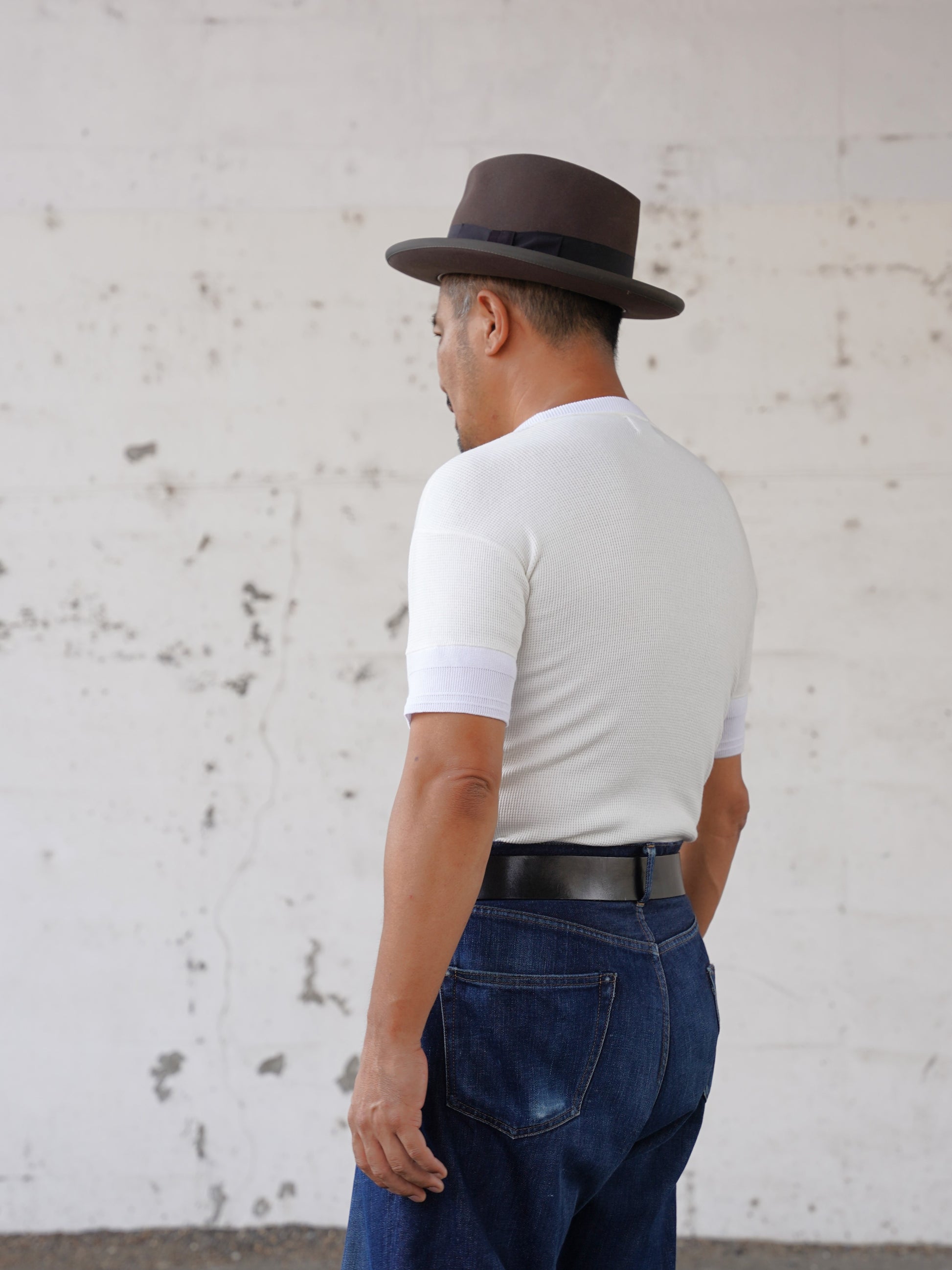 1940年代~1950年代に実在したアメリカのビンテージサマーニットをリアルに復元した製品です。リブの長さ、袖、生地のオンスも忠実に再現しています。生地ベースは当時のオリジナルを同じサイズで型取り仕込みました。スラックスやデニムにも融合する夏には欠かせない製品です。