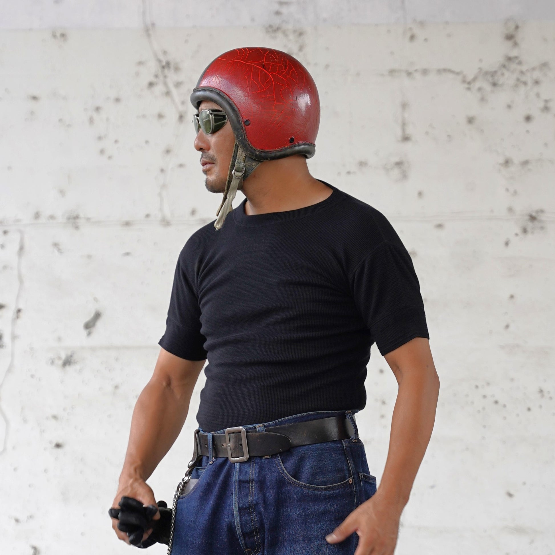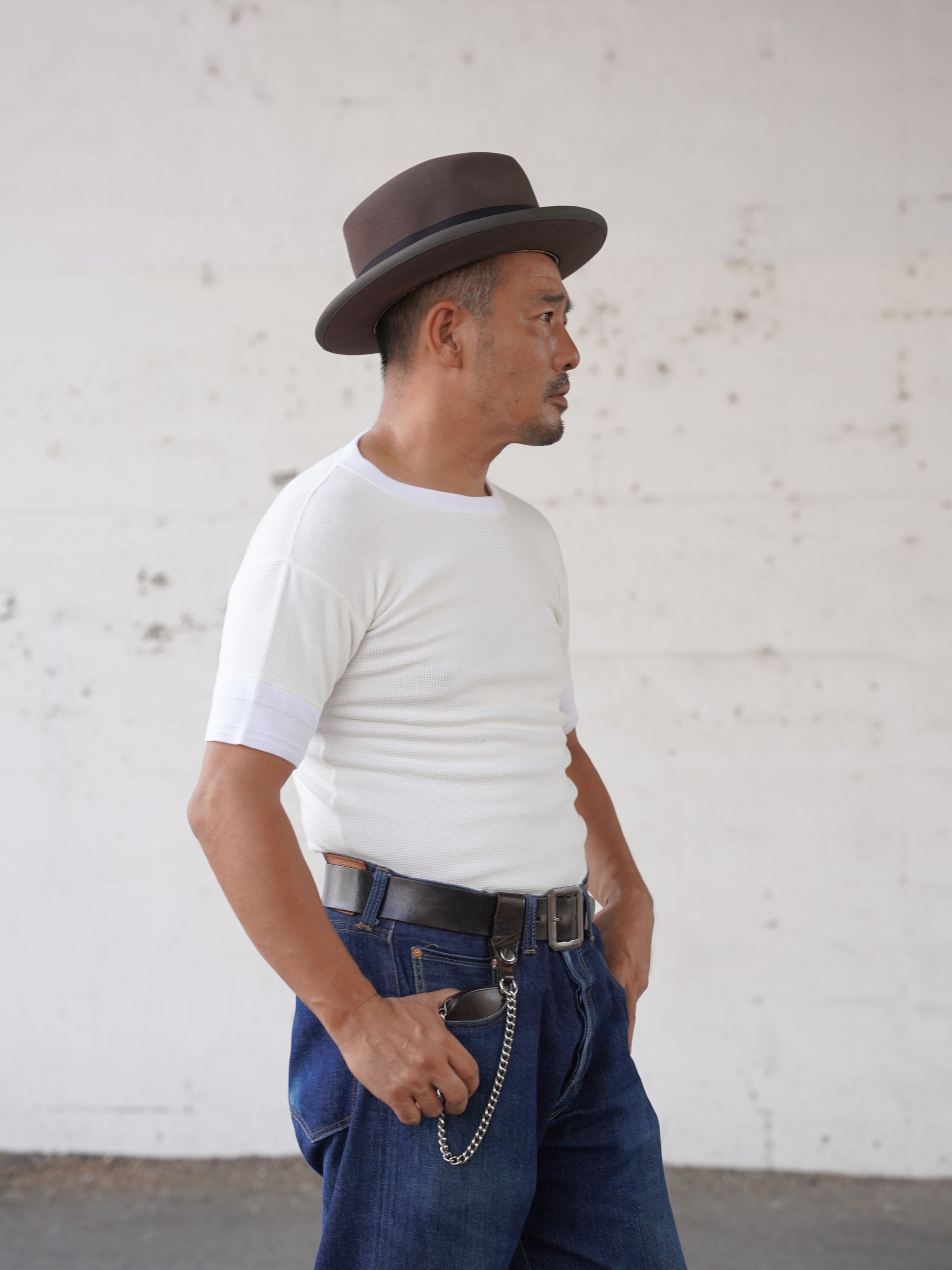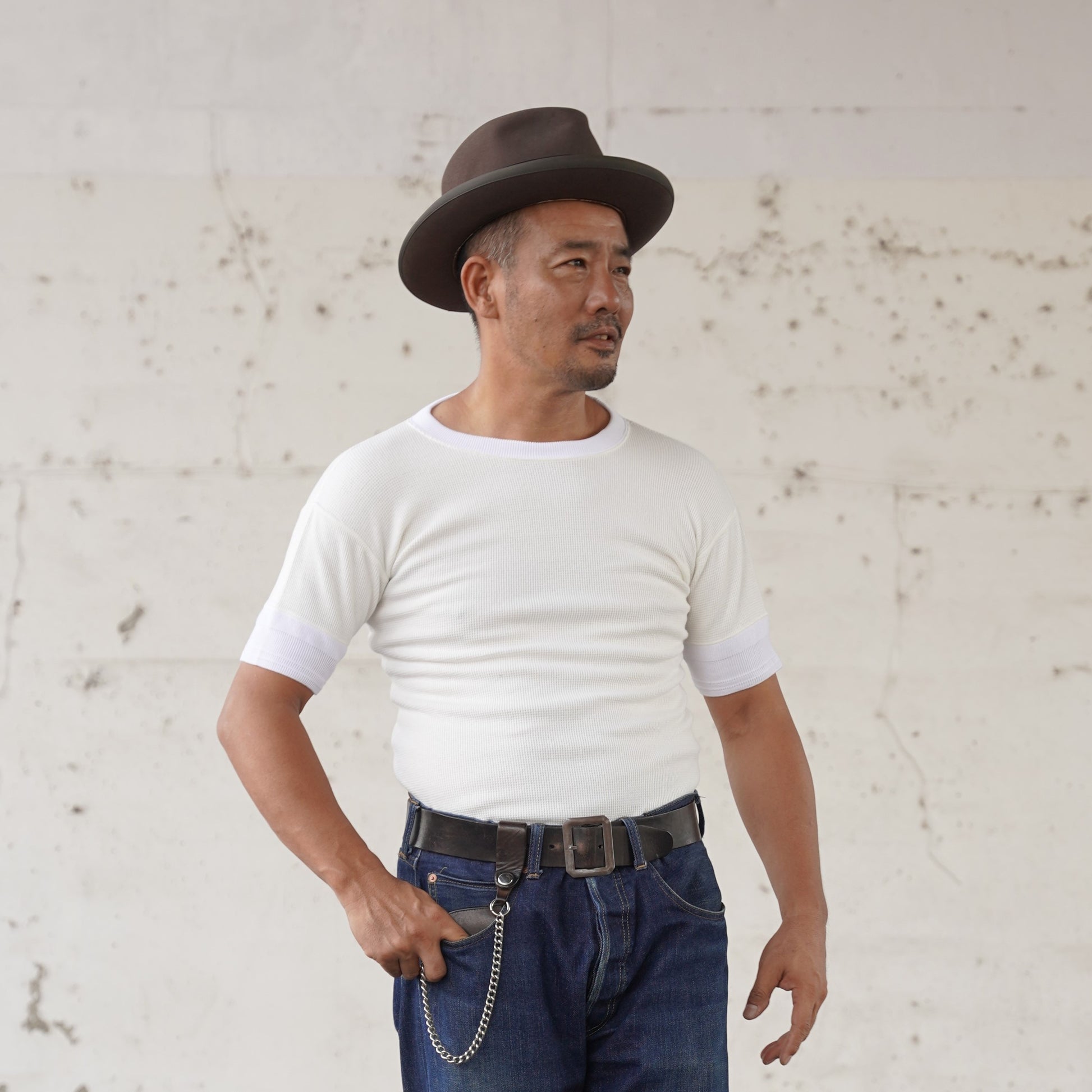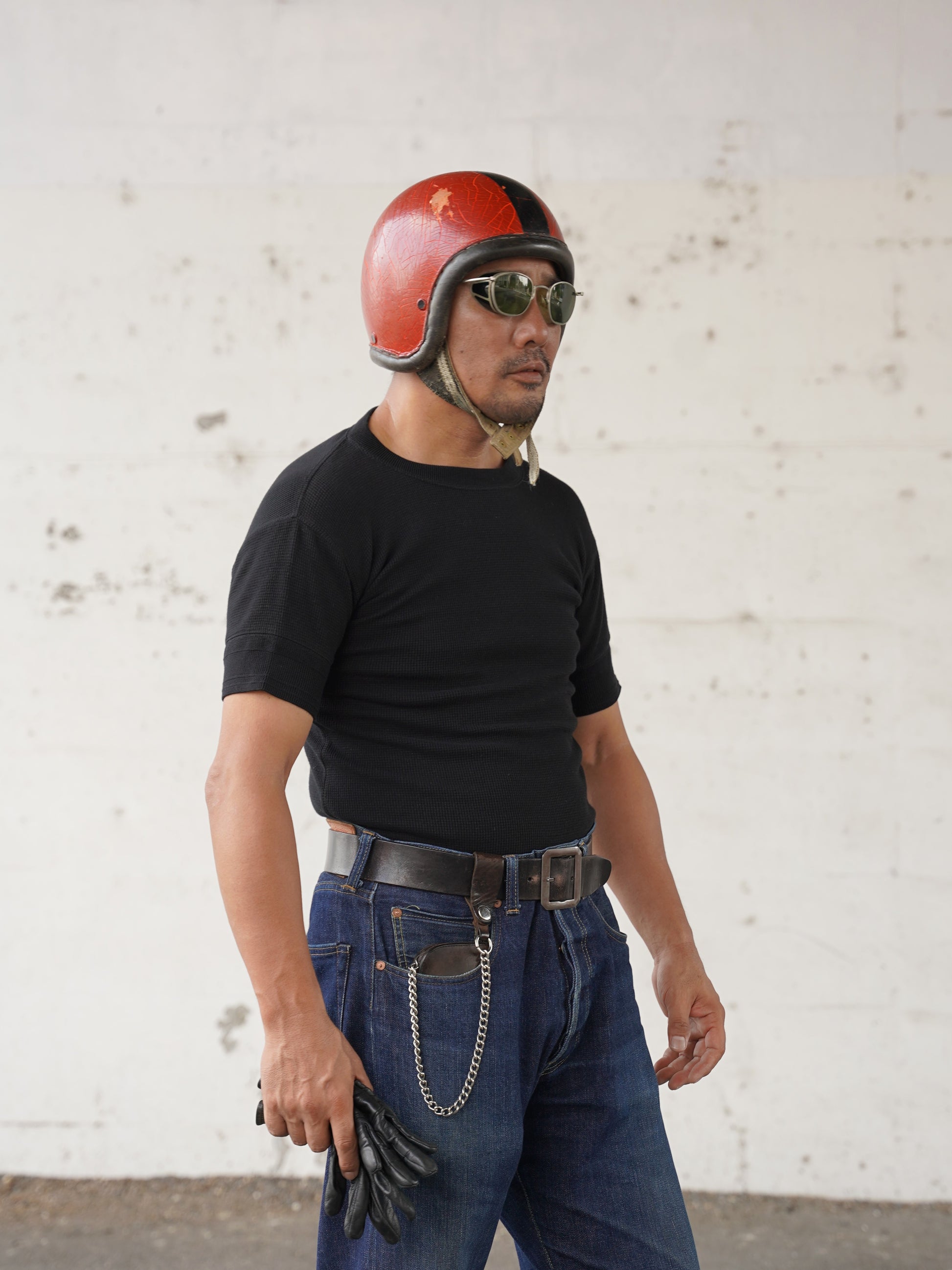 1940年代~1950年代に実在したアメリカのビンテージサマーニットをリアルに復元した製品です。リブの長さ、袖、生地のオンスも忠実に再現しています。生地ベースは当時のオリジナルを同じサイズで型取り仕込みました。スラックスやデニムにも融合する夏には欠かせない製品です。