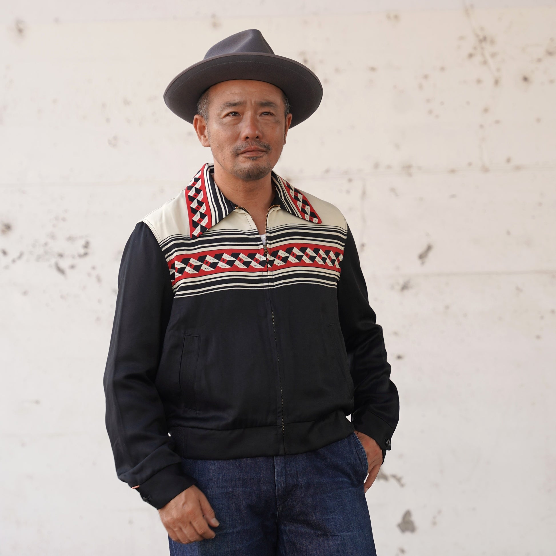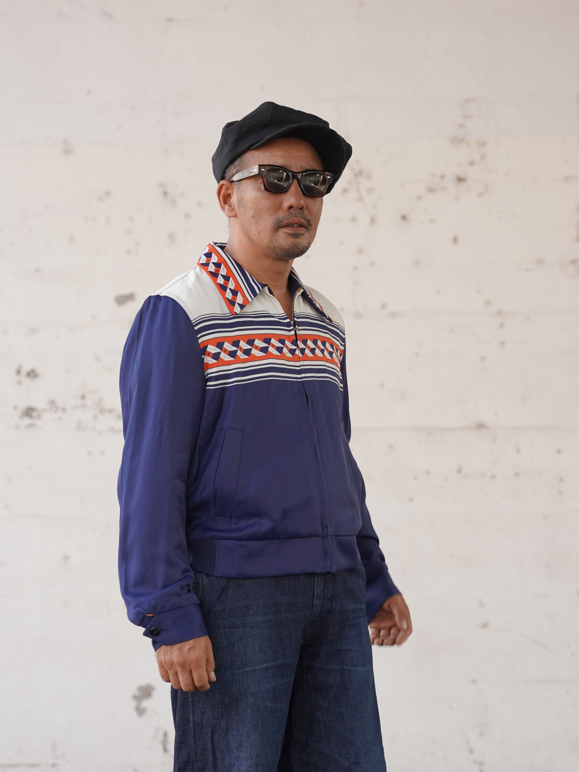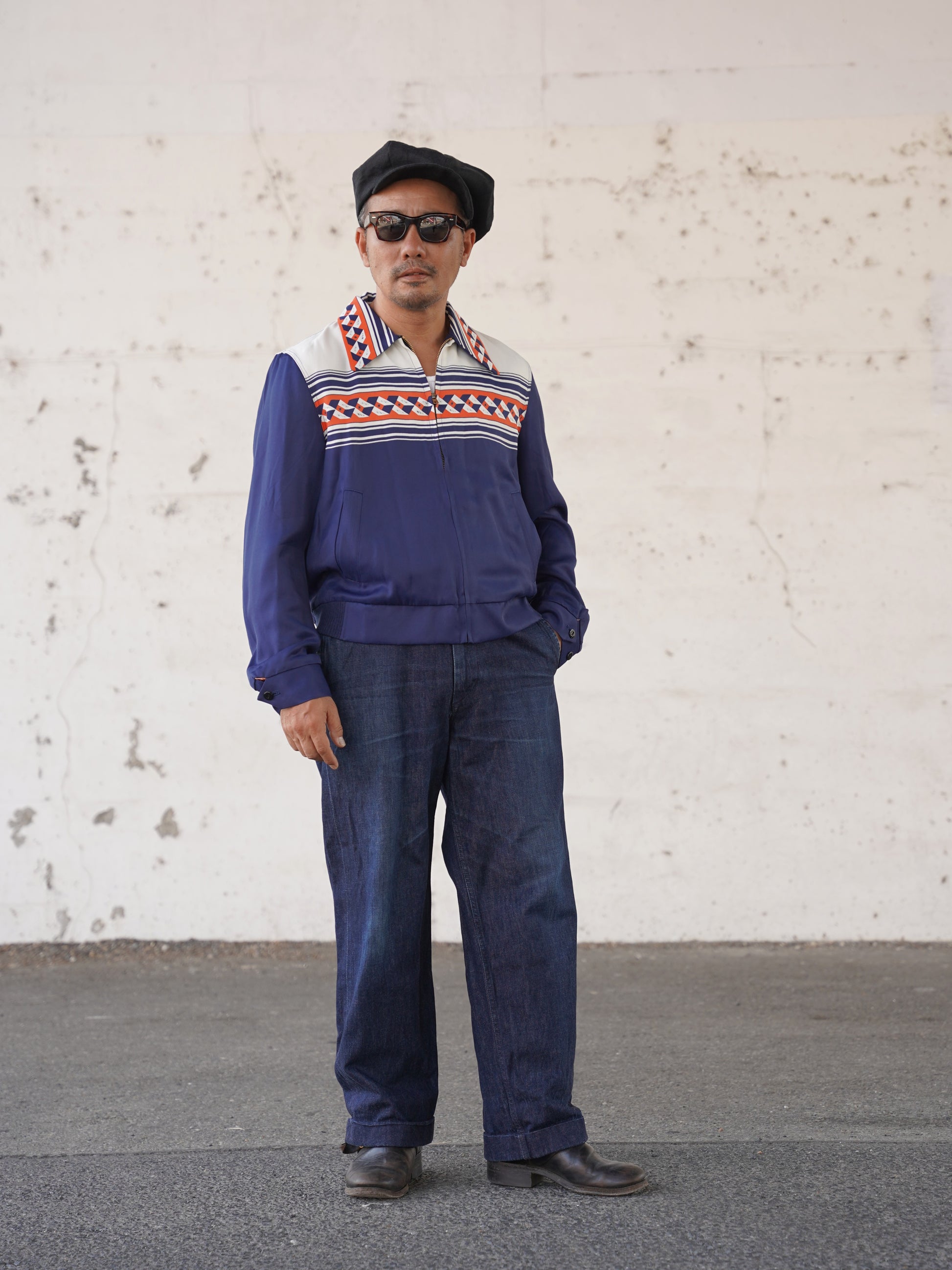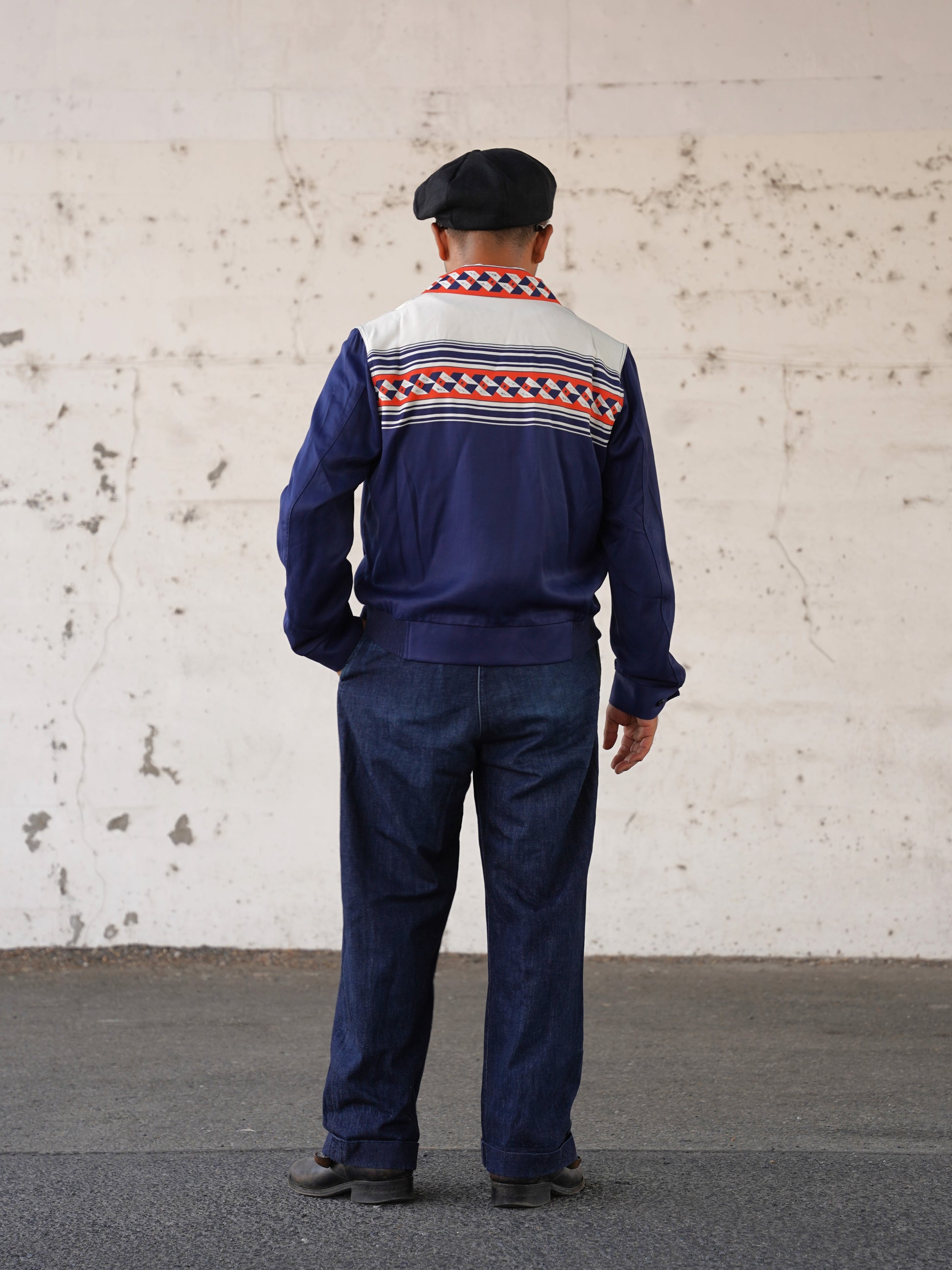 1950年代の王道なギャバスポーツジャケットを復元した製品です。ビンテージのジャケットの中から厳選された現代にも溶け込むシルエットです。ドレープ感のある国産の肉厚レーヨン生地に、オリジナル同様に抜染プリントで仕上げています。裏地はオリジナルのレーヨンコットン、USAタロンジップを使用して制作しています。