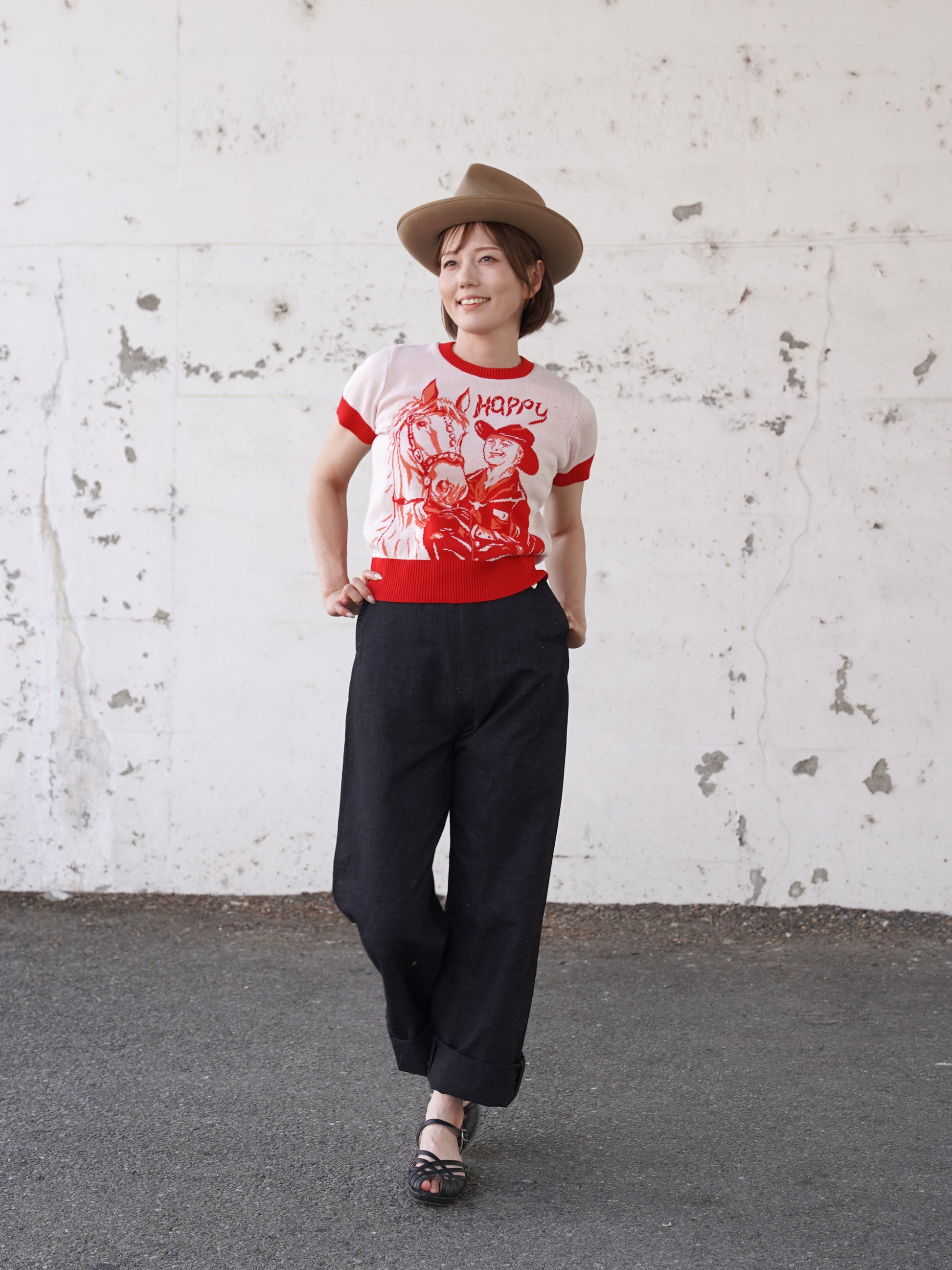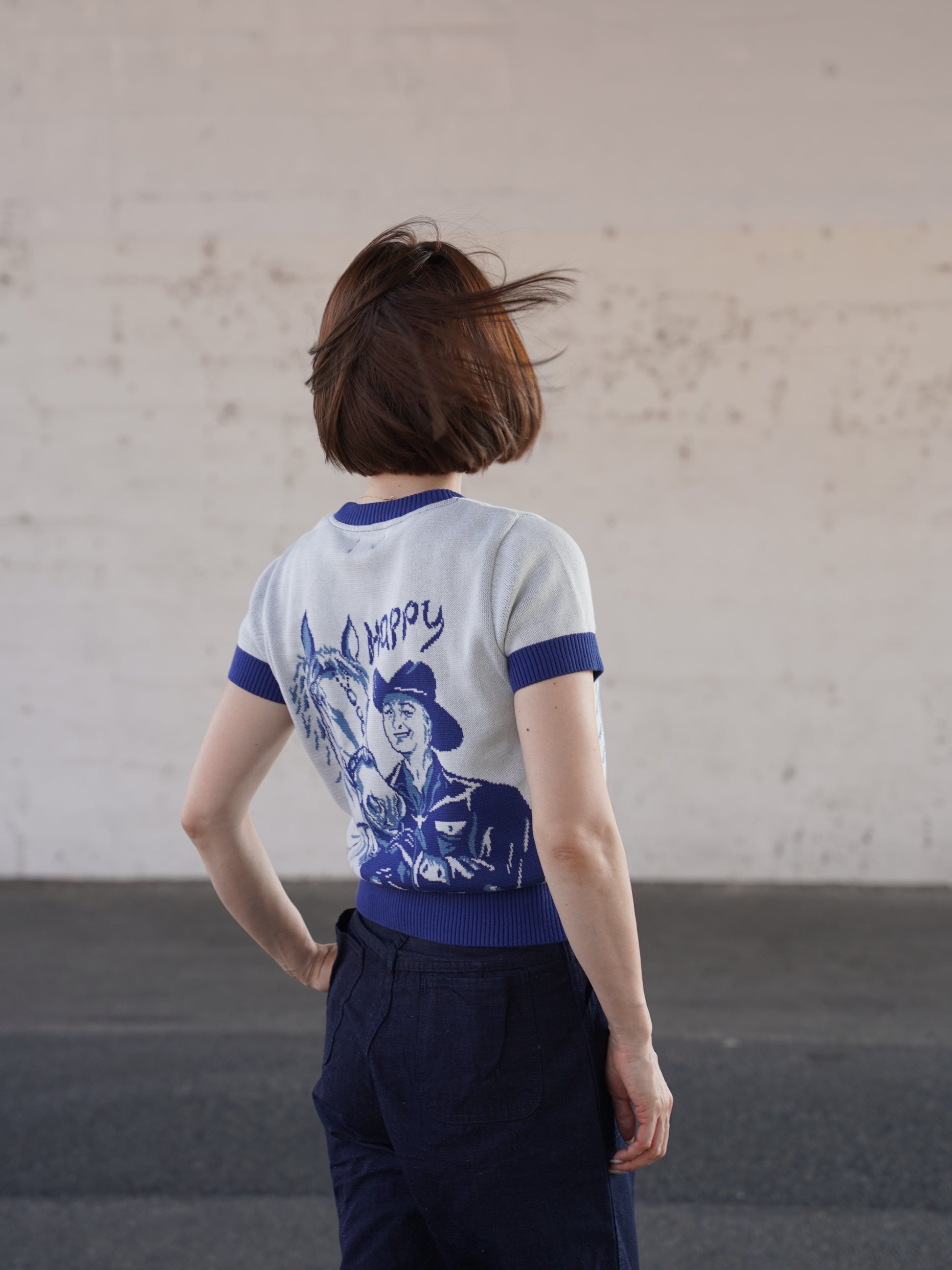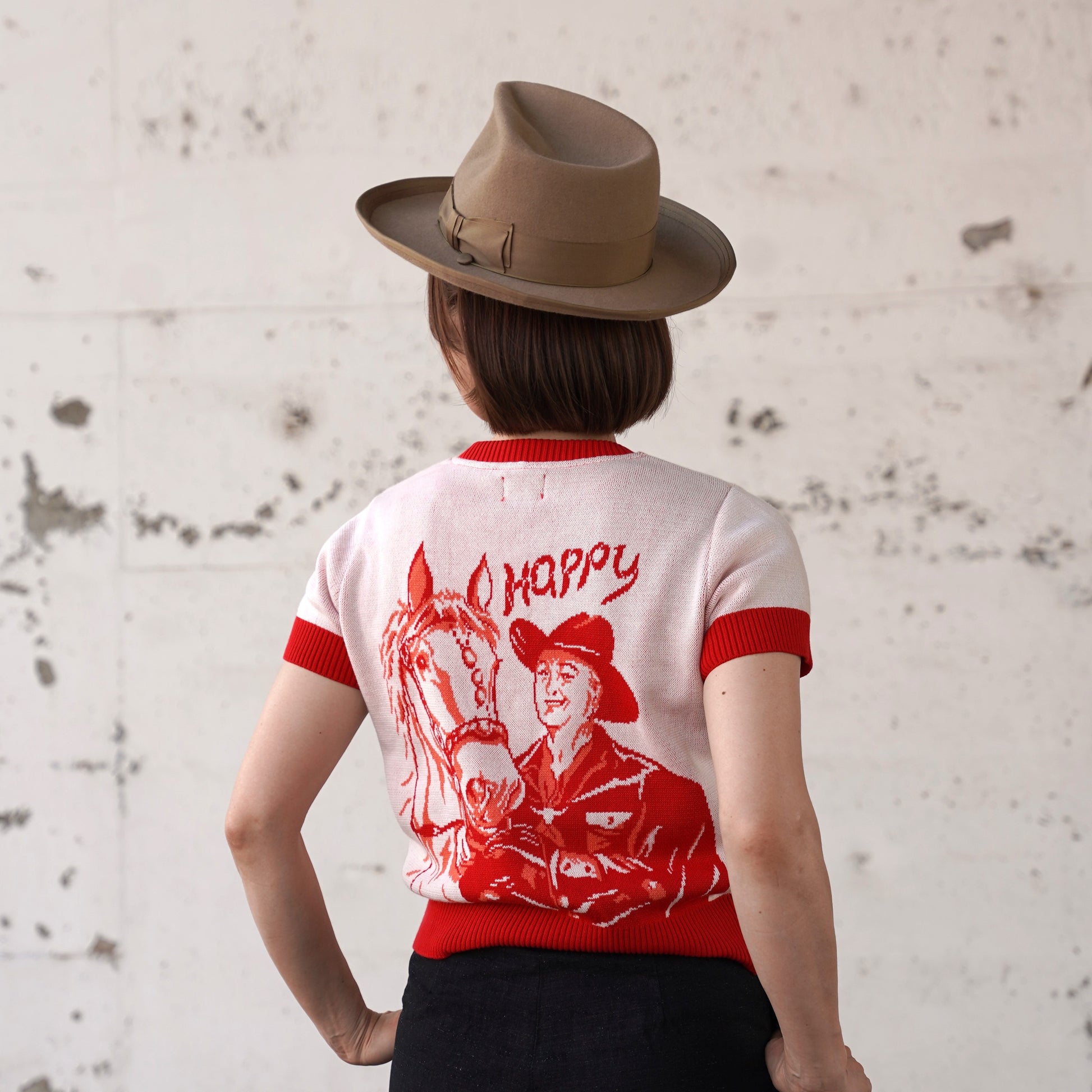 1940年代~1950年代に実在したアメリカのビンテージサマーニットを、レディース用にリブの長さやシルエットを調整しました。ジャガードは当時のオリジナルを同じサイズで型取り仕込みました。夏には欠かせない製品です。