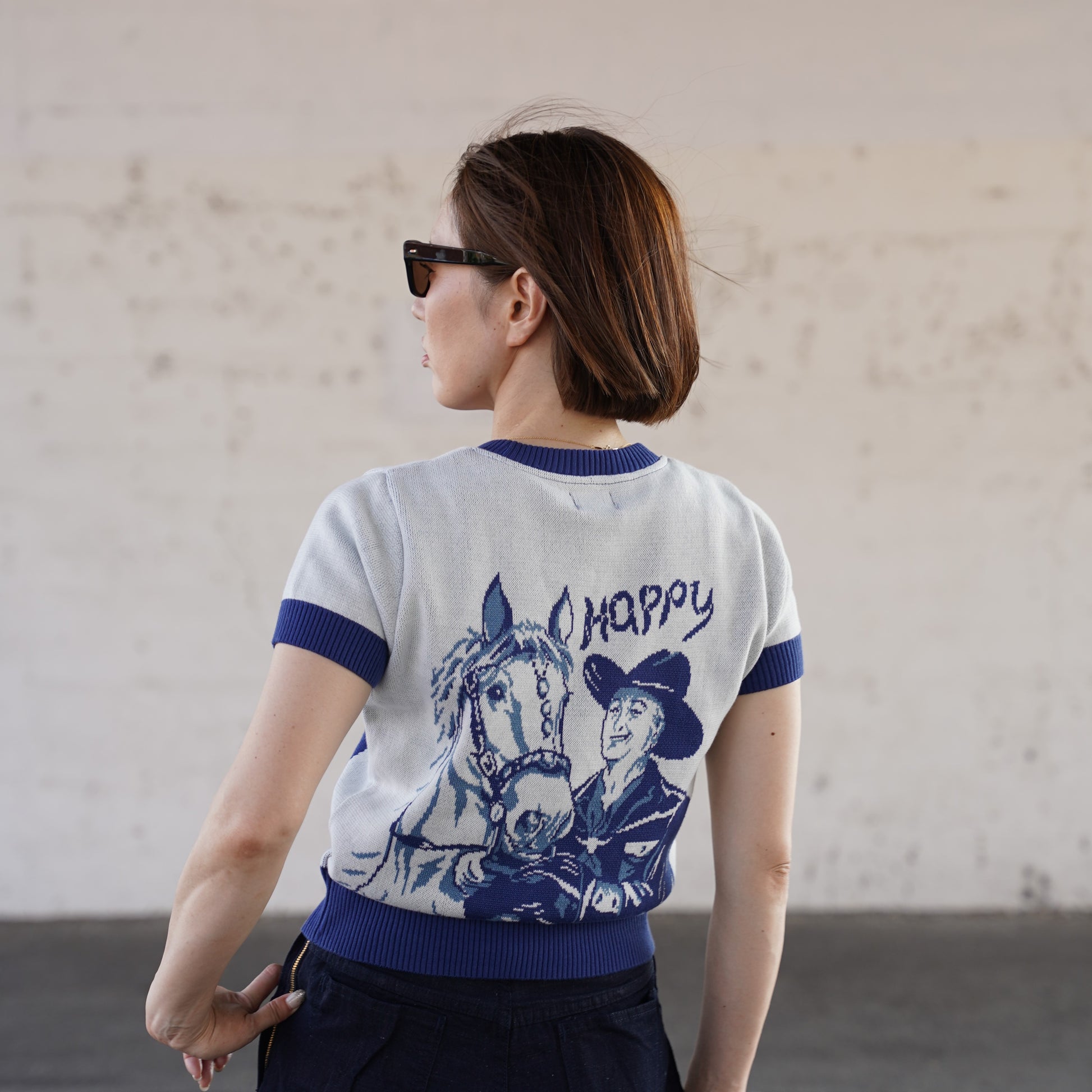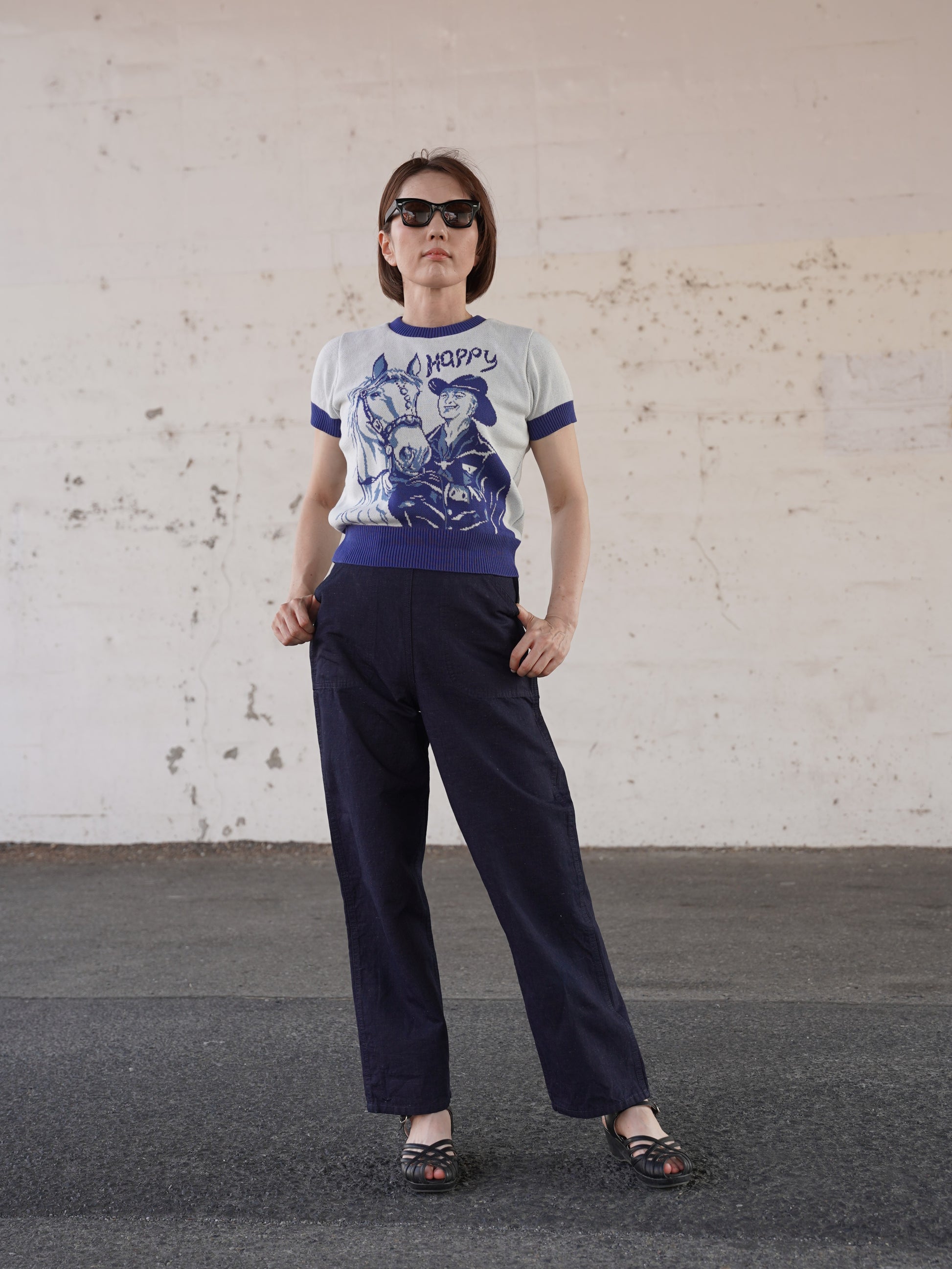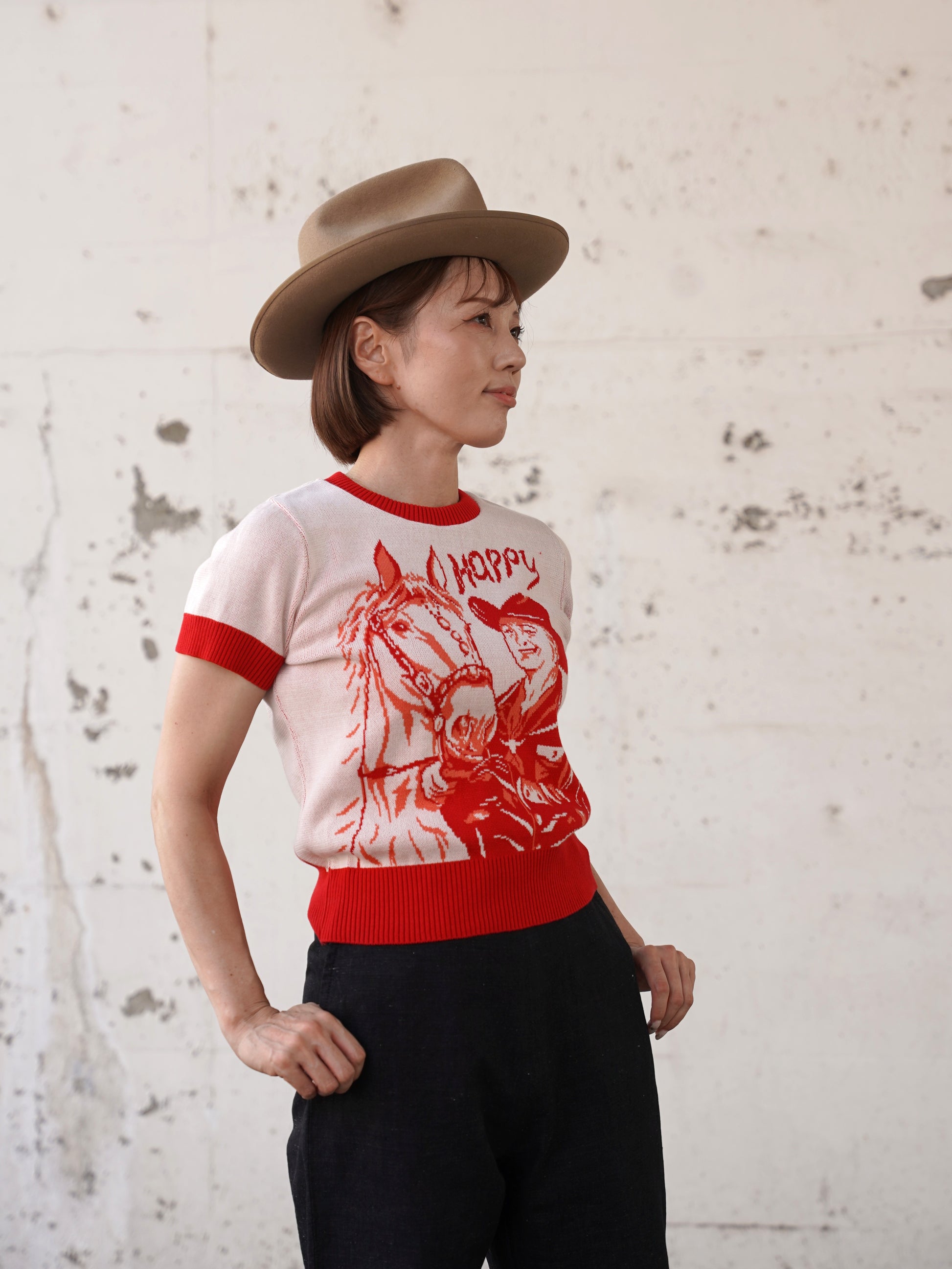1940年代~1950年代に実在したアメリカのビンテージサマーニットを、レディース用にリブの長さやシルエットを調整しました。ジャガードは当時のオリジナルを同じサイズで型取り仕込みました。夏には欠かせない製品です。