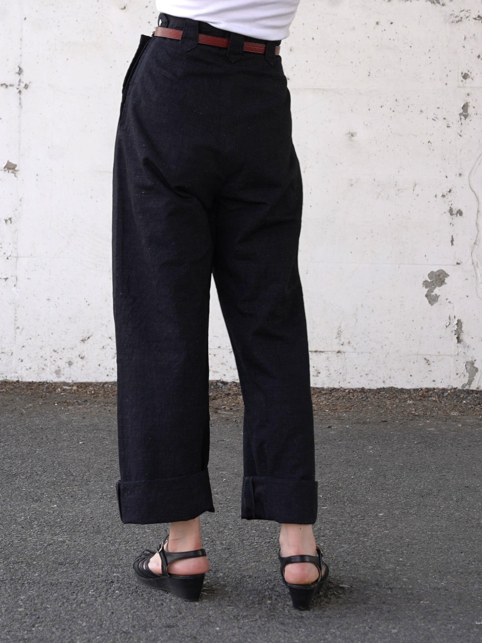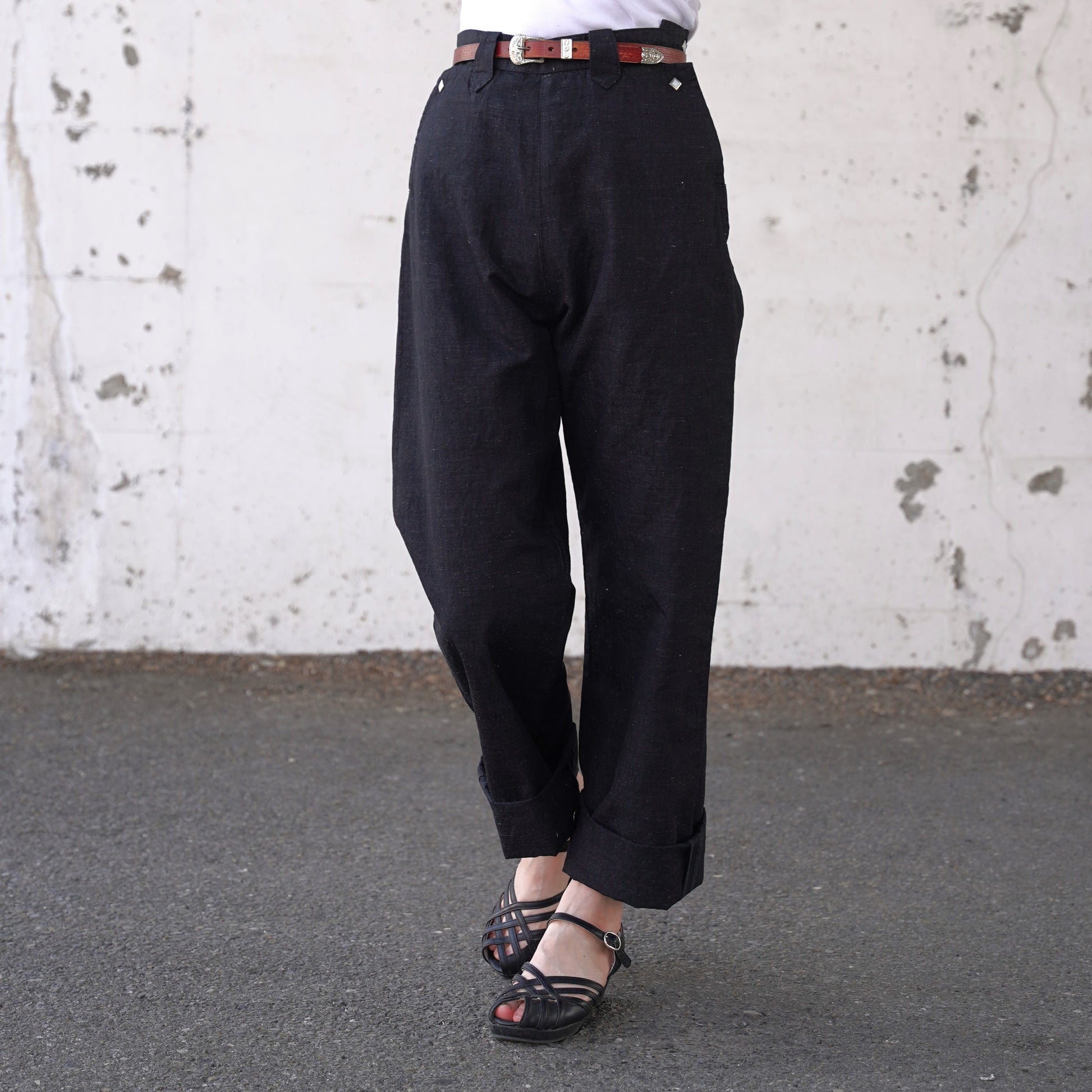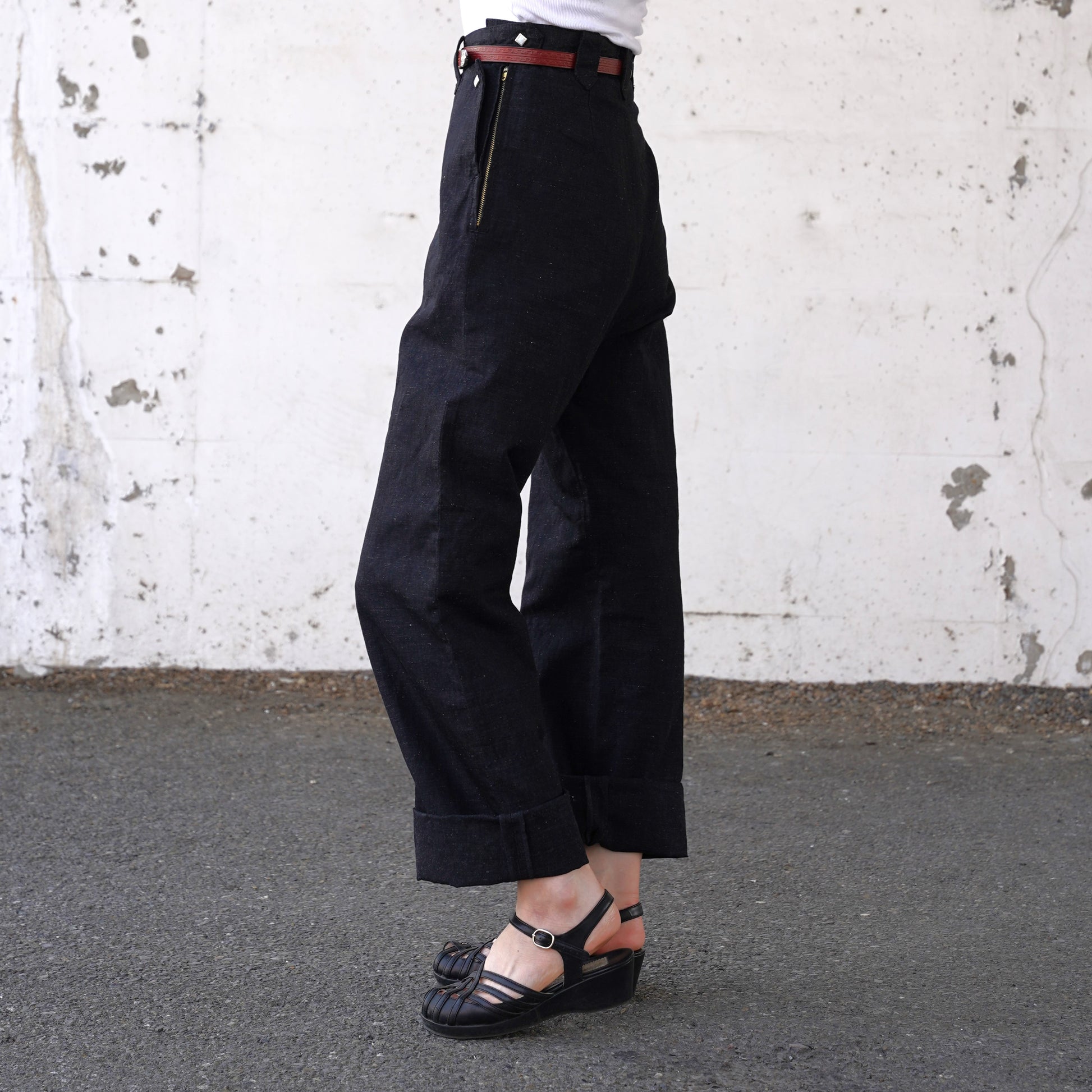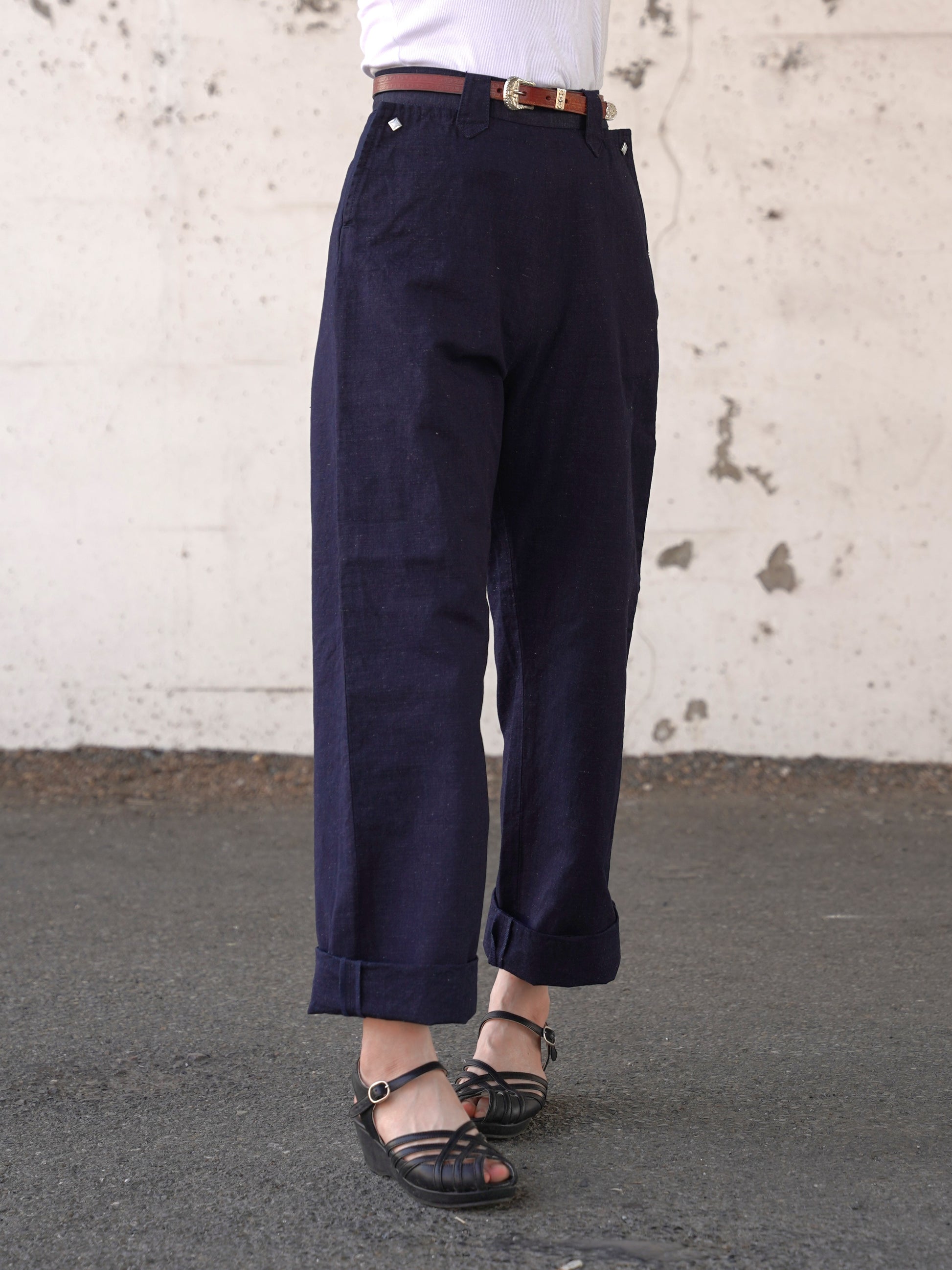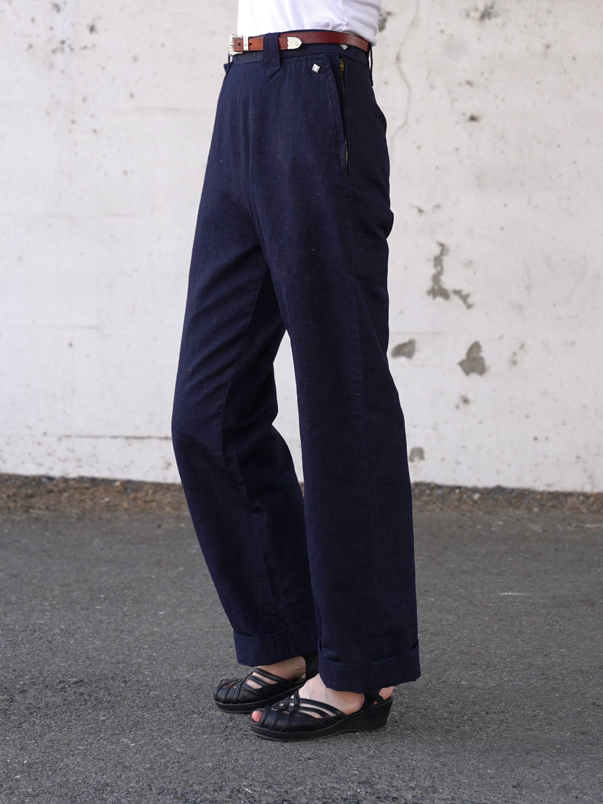 1950年代の初期型を復元したレディースウェスタンデニムパンツです。岡山産のコットンリネンで、雰囲気のあるエイジングが楽しみな生地を使用しています。ボタンも50年代当時と同様の四角型。ジッパーはUSAタロンジッパーを使用。ビンテージ感ある太目のシルエットが特徴です。